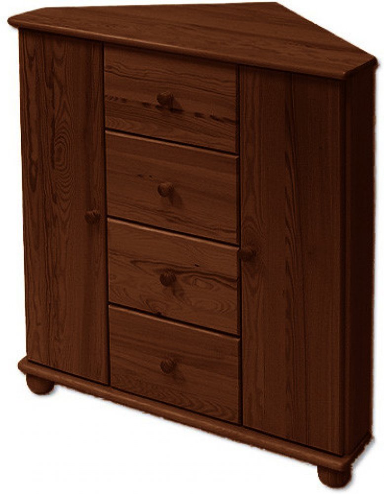 Kvalitní dřevěná komoda je vyrobena z borovicového masivu. Nabízí k ukládání čtyři zásuvky (šuplíky) a dvě skříňky se dvířky. Komoda má zkosený tvar pro vyplnění rohu místnosti. Hrany půdy a dna jsou zaoblené. Doporučujeme připevnění ke stěně.