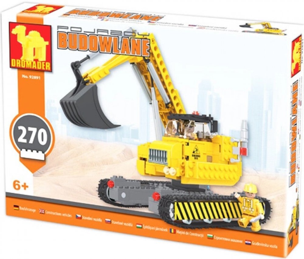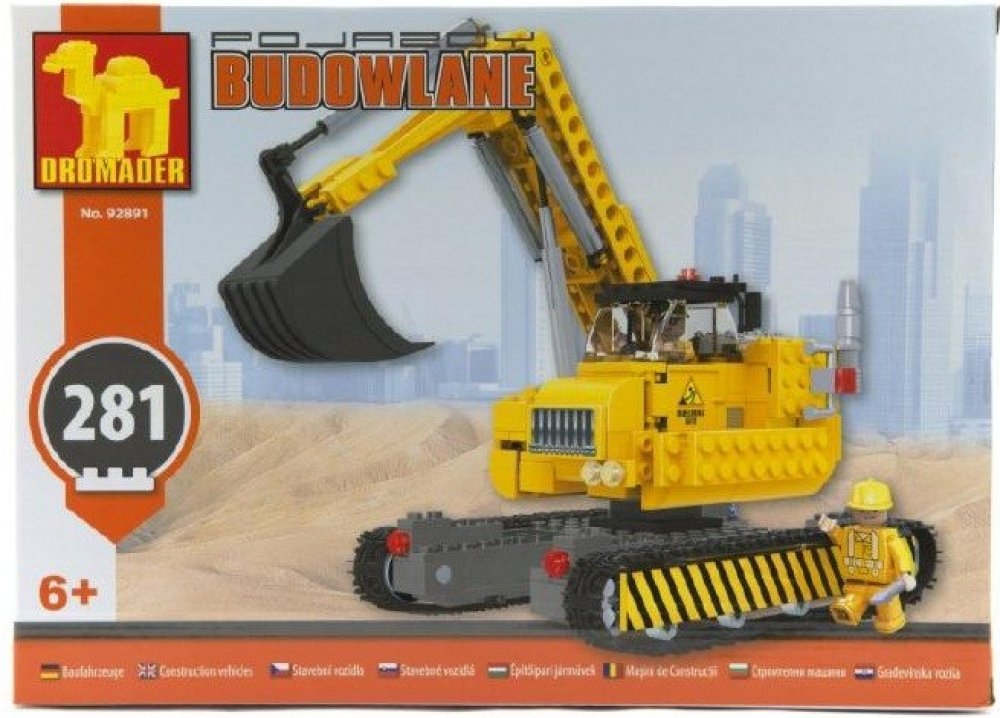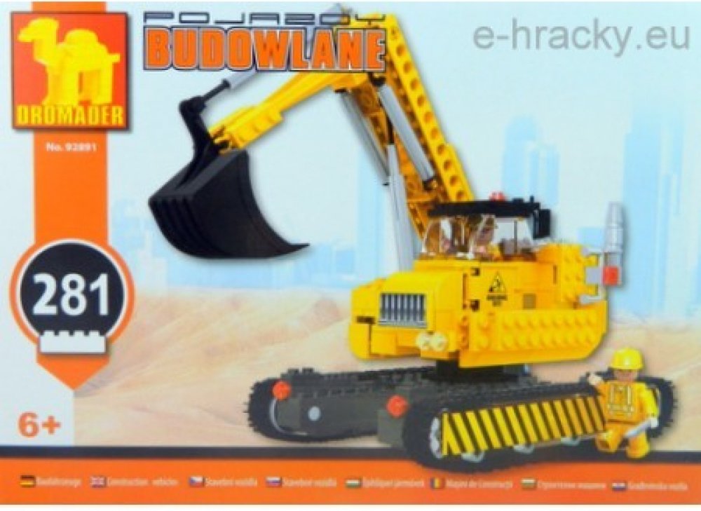 Dromader stavebnice 92891 Bagr 281 dílků. Ze stavebnice pro děti Dromader sestavíte velký stavební bagr - nakladač. Stavebnice je ideální hračkou, která rozvíjí tvořivé a kombinační schopnosti dítěte. Stavebnice Dromader rozvíjí logické myšlení, učí děti trpělivosti a vytrvalosti. Stavebnice obsahuje 281 dílků. Je plně kompatibilní se stavebnicí Lego. Velikost balení 35 x 25,5 x 5,5 cm. Věk 6+