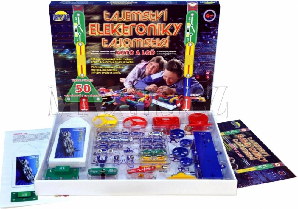 Podrobný návod v češtině nabízí schémata 50 projektů. Navíc model loďky a auta k sestavení funkčních strojů. Vstupte do tajemného světa elektroniky a elektrotechniky. Díky jednoduchému principu sestavování přehlédnému rozložení děti snadno pochopí princip elektrických obvodů. Vinikající i jako školní pomůcka nebo nástroj pro vlastní domácí projekty.