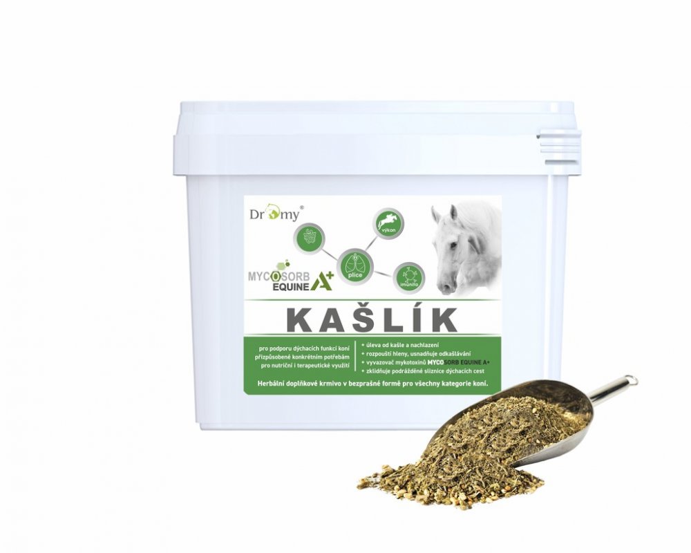 Dromy Kašlík A+ s vyvazovačem mykotoxinů je bylinná směs s vyvazovačem mykotoxinů pro zlepšení dýchacích funkcí u koní
