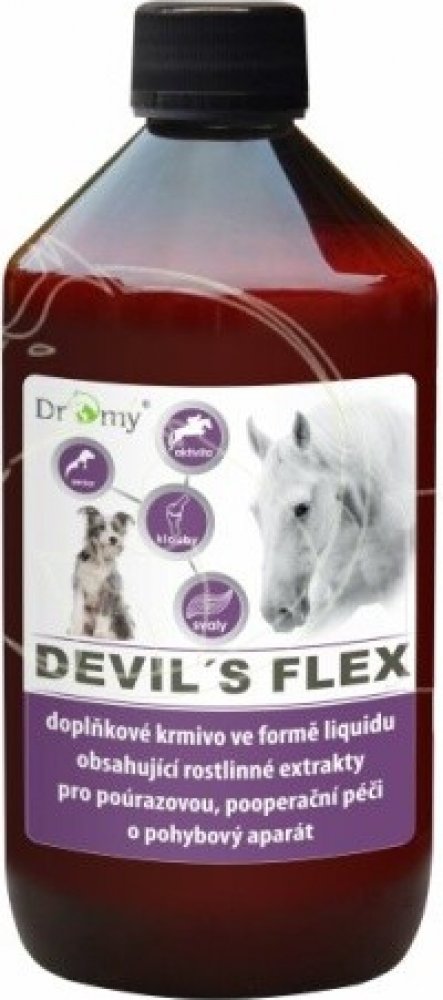 Krmný doplněk Devil´s Flex s obsahem rostlinných extraktů vykazující analgetické a antiflogistické účinky. Podporuje regeneraci měkkých tkání. Vhodné pro vysoce zatěžované sportovní koně, pro koně, u kterých bylo diagnostikováno degenerativní onemocnění pohybového aparátu, pro urychlení poúrazové a pooperační péče. Obsahuje složky, které se výrazně podílejí na: •omezení zánětlivých procesů •regeneraci tkání po prodělaném zánětu •intenzivní podporu lymfatického a oběhového systému •účinné ochraně buněk, před poškozením volnými radikály Krmný doplněk s obsahem rostlinných extraktů vykazující analgetické a antiflogistické účinky. Podporuje regeneraci měkkých tkání. Vhodné pro vysoce zatěžované sportovní koně, pro koně u kterých bylo diagnostikováno degenerativní onemocnění pohybového aparátu, pro urychlení poúrazové a pooperační péče. Doplněk DEVIL´s Flex liquid nabízí kombinaci aktivních látek, které účinně působí na zmírnění symptomů zánětlivých a degenerativních procesů pohybového aparátu. Rostlinný extrakt Devil´s claw - ďábelský dráp - Harpagophytum procumbens - má protizánětlivé, protirevmatické, analgetické, sedativní, diuretické účinky. Tyto vlastnosti rostlinné drogy byly uznány British Herbal Medical Association a Britskou farmakologickou společností (British Pharmacopoeia). Extrakty Boswellie serraty, Yuccy shidigery a MSM se výrazně podílejí na eliminaci zánětu. Zvyšují účinnost protizánětlivého hormonu kortizolu (nikoliv jeho množství), mají protizánětlivý, anti-alergický a imunogenní účinek. White willow bark extrakt je zdrojem salicinu, který se přirozeně vyskytuje v kůře vrby bílé. Jelikož se svými vlastnostmi řadí mezi analgetika, antipyretika a antiflogistika, jeho použití je vhodné při vnitřních zánětech šlach a svalů, kloubů, poúrazových stavech. Extrakty Kaštanu koňského a Přesličky rolní podporují lymfatický a oběhový systém. Současně působí protizánětlivě a urychlují vstřebávání otoků vzniklých po poranění. Hořčík v organické formě je důležitý pro normální činnost nervů a svalů, přináší uvolněnost tkání, orgánů, napomáhá při bolestivém, svalovém napětí. Účinek extraktů je velmi rychlý a nastupuje obvykle - do 5-ti dnů od počátku podávání. Mechanismus jeho působení je podobný jako u nesteroidních anti-revmatik, je bezpečný a nemá negativní účinky na trávicí trakt a je velmi dobře snášen. Upozornění: Obsahuje složky uvedené v seznamu zakázaných látek, doporučujeme vysadit 7 dní před plánovanou soutěží !!! Nepoužívejte v průběhu březosti a laktace !!! Doporučená dávka pro koně o váze 550-600 kg: v akutních případech a zranění po dobu 5-ti dnů 50 ml denně, pak pokračovat 30 ml denně do krmné dávky. Před použitím protřepat !!! Obsah v 1 litru doplňkového krmiva: MSM - methylsulfonylmethan 100g, Boswellia serrata extrakt 60g, White willow bark extrakt 60g, Harpagophytum procumbens extrakt 50g, Vitamin C 16g, Hořčík - organická forma 10g, Yucca shigidera extrakt 10g Balení: 1ltr.