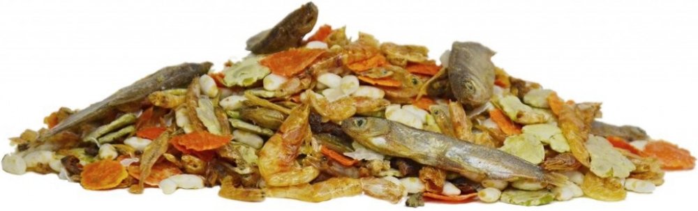 hnědá rýže vločky natural, pufovaná rýže, pufovaný ječmen, krevety, ančovičky, sardinky, mrkev, hrachové vločky, rajče.