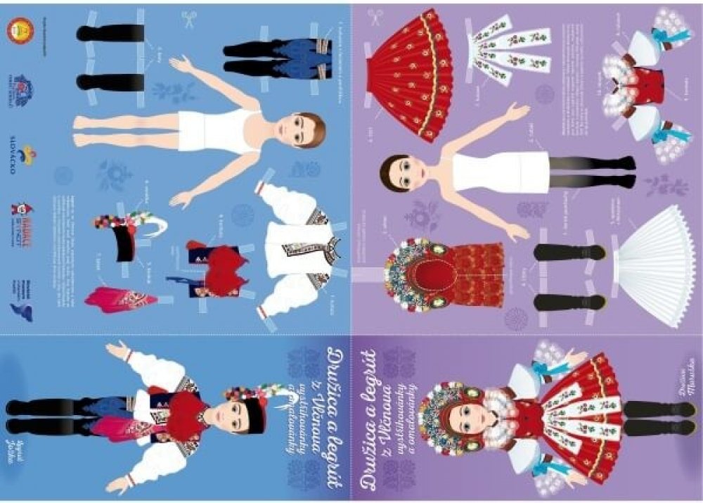 Originální vystřihovánka a omalovánka v jednom - výsledkem vaší zhruba hodinové práce bude dvojice v kroji z Vlčnova - družica a legrút.