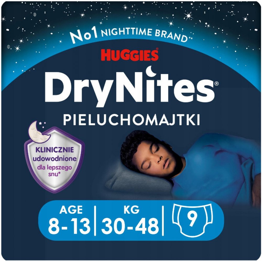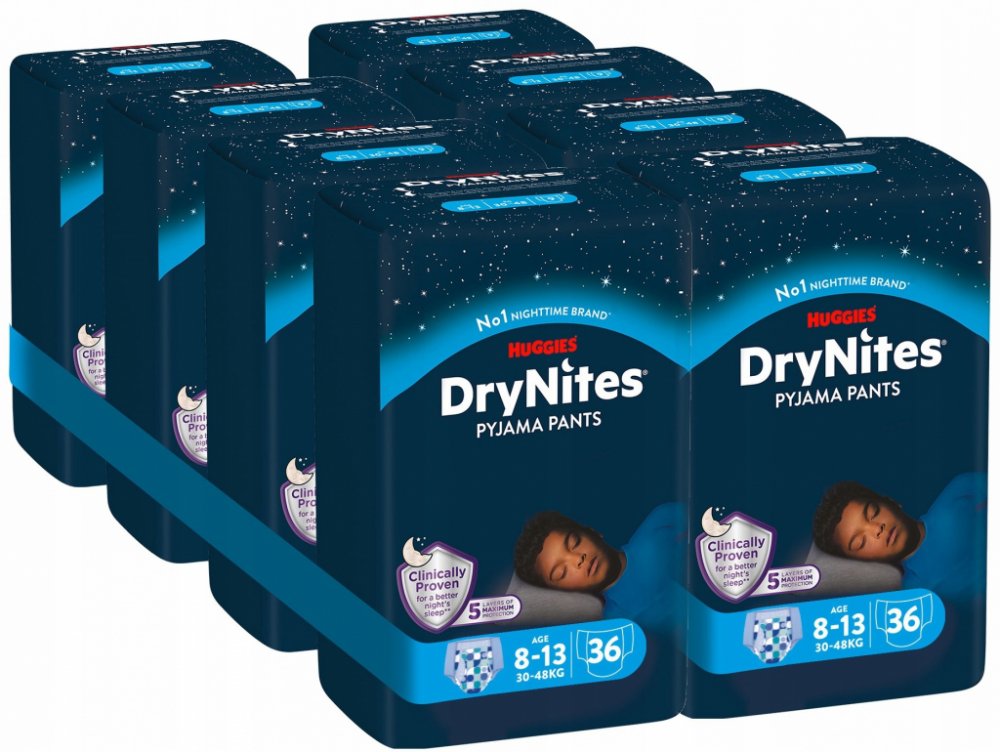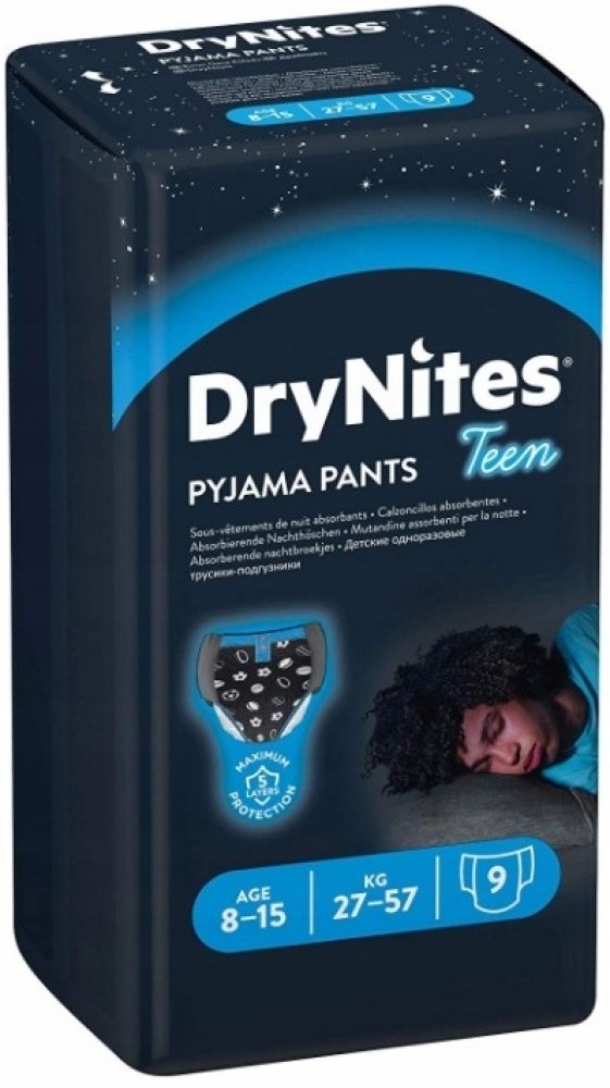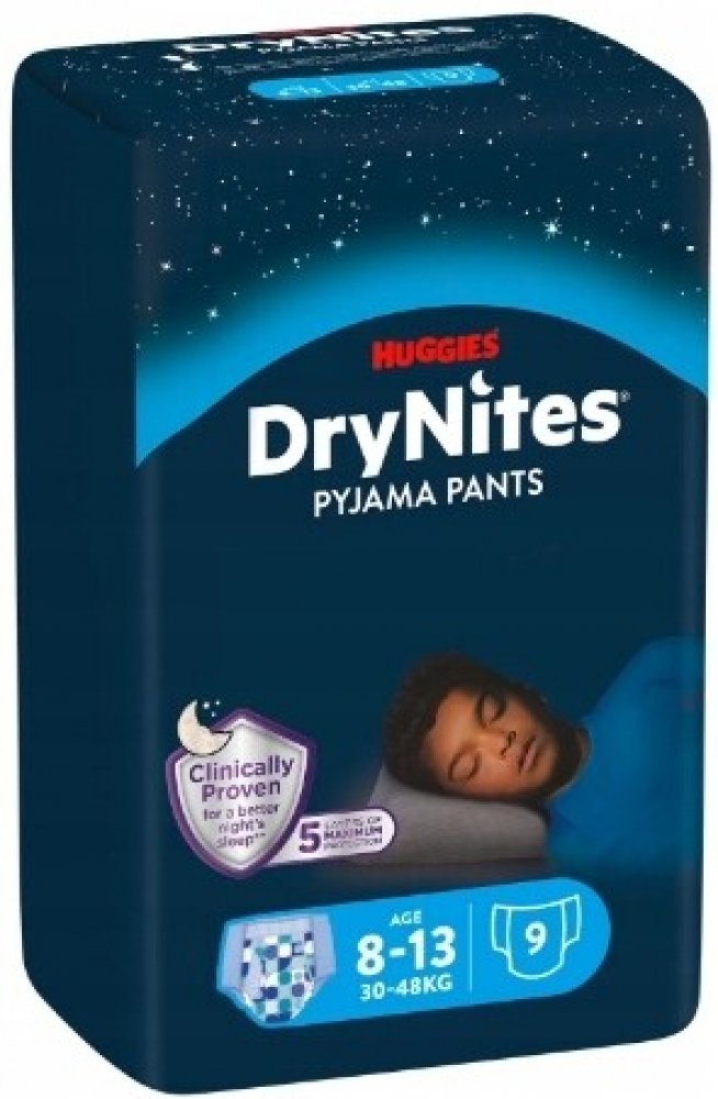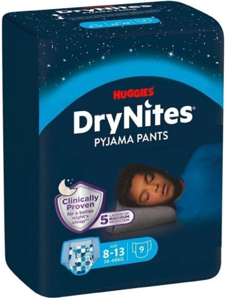 Huggies DryNites Pyjama Pants Boys jsou speciální natahovací plenkové kalhotky pro starší děti na noc pod pyžamko. Díky podobnosti s běžným spodním prádlem jsou velmi diskrétní a spolehlivé. Pro chlapce ve věku 8 – 15 let (27 – 57 kg).