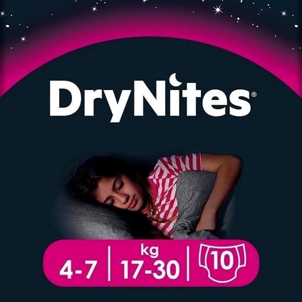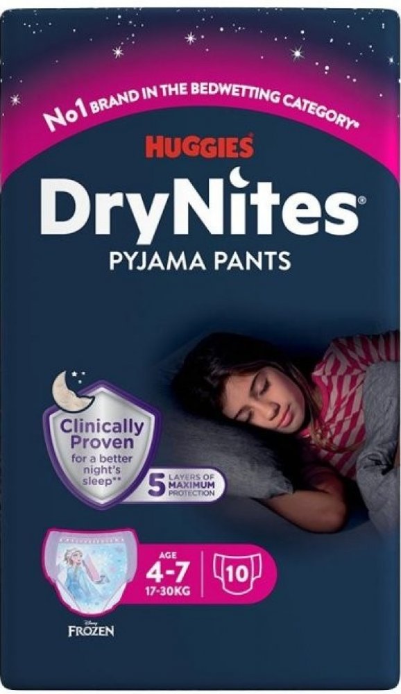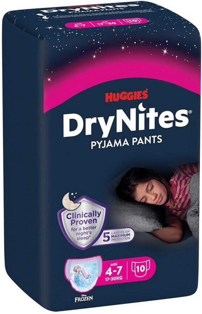 Popis Huggies Dry nites absorbční kalhotky 4-7 let/girls/17-30kg 10ks