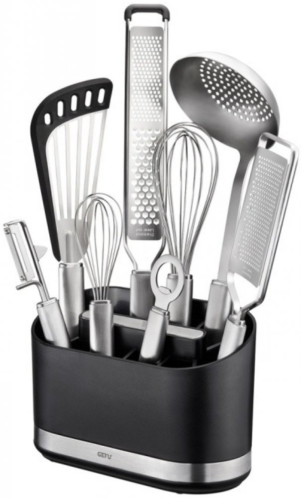 V 10 přihrádkách stylově řešeného držáku na nádobí najdou své místo malí i velcí kuchyňští pomocníci. Vyjímatelná vložka usnadňuje čištění. Záměrně těžká základní deska a protiskluzové nožičky zajišťují stabilitu.
