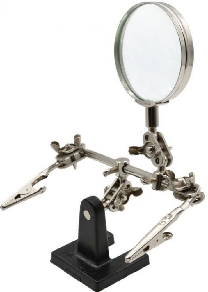 Při některých pracích si člověk říká, že by potřeboval mít ještě třetí ruku a lepší oči. Nic není nemožné. Umožní Vám to tento šikovný držák s lupou - třetí ruka. Tuto praktickou vychytávku uvítají především ti, kteří se věnují elektronickým a elektrotechnickým pracím. Souprava obsahuje lupu, stativ a držák, neboli třetí ruku. Díky lupě uvidíte i na ty nejmenší součástky a pomocí držáku si můžete přidržet další předměty. Držet lupu, opravovat a zároveň ještě přidržovat předmět může být obtížné. Díky této třetí ruce bude každá práce snadnější. Pokud opravujete například hodinky, šperky či jiné předměty, tuto věcičku uvítáte. Skvělý pomocník pro pájení a cínování elektrických součástek, drátů, tak aby nedocházelo ke studeným spojům.