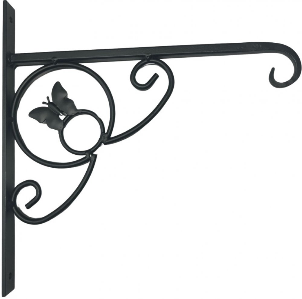 Držák na květináče nebo koše květin v černé barvě zdobený kohoutem. Upevňuje se na zeď, pergolu nebo plot pomocí vrutů a hmoždinek, které jsou součástí balení. Jemné motýlí křídla působí dojmem lehkosti, ale jejich konstrukce je velmi pevná a udrží i velké květináče.