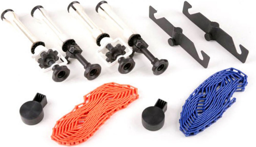 Držáky pro uchycení 2 rolí foto-pozadí na studiové stativy a 2x sada rozpínacích trnů pro papírové/hliníkové role pozadí s řetízky a závažím. Plastový řetěz se dá jednoduše zkracovat podle potřeby.Délka řetězu 365cm.Balení obsahuje:1x sada dvou držáků2x pár rozpínacích trnů2x závaží na řetěz2x řetěz (plastový)