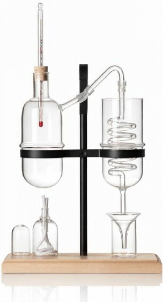 Sada v dárkovém balení. Sada v dárkovém balení Během krátké doby můžete pomocí tohoto malého přístroje vydestilovat z červeného, nebo bílého vína brandy. Metoda je velmi jednoduchá. Pomocí nálevky naplníte varnou baňku do poloviny červeným, nebo bílým vínem a vložíte teploměr. Chladící nádobu naplníte po okraj studenou vodou. Do kahanu nalijete syntetický líh, zapálíte knot a vložíte pod baňku. Sl...