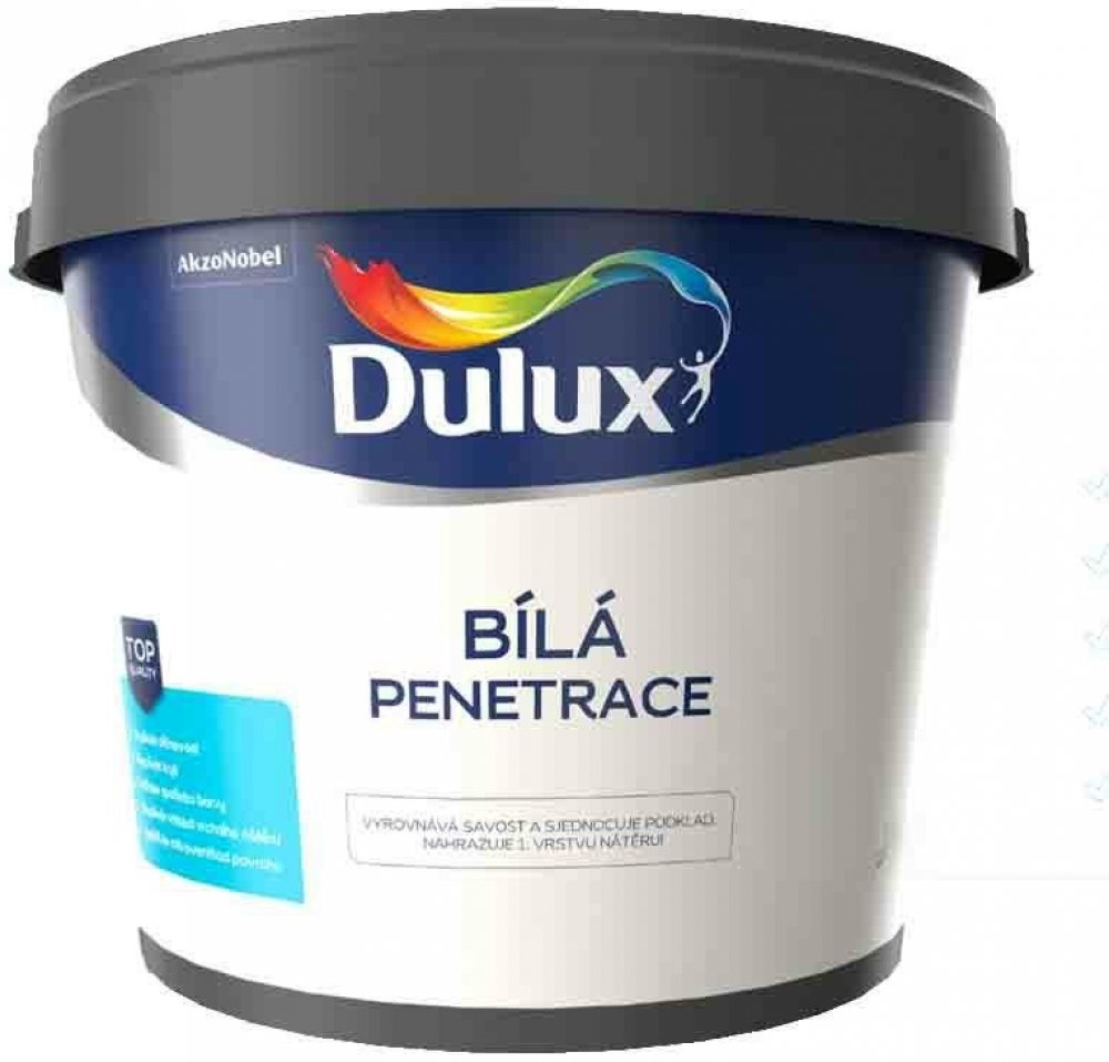 Podrobnosti o produktu AN 1052-5757104 15 kg Dulux Bílá Penetrace je disperzní krycí základní nátěr na stěny a stropy v interiéru, který vyrovnává savost, sjednocuje povrch a zajištuje tak optimální podklad pro vrchní nátěr. Díky skvělé kryvosti zároveň nahrazuje 1. vrstvu nátěru! Zlepšuje přilnavost finální vrstvy emulzních nátěrů (disperzní, akrylové, vinylové aj.) Zvýrazňuje dekorativní efekt a dokonalost výsledného vzhledu vrchního nátěru. Zajištuje správnou mikroventilaci povrchu (dýchání stěn). Snadno se nanáší, rychle schne a neodkapává. :