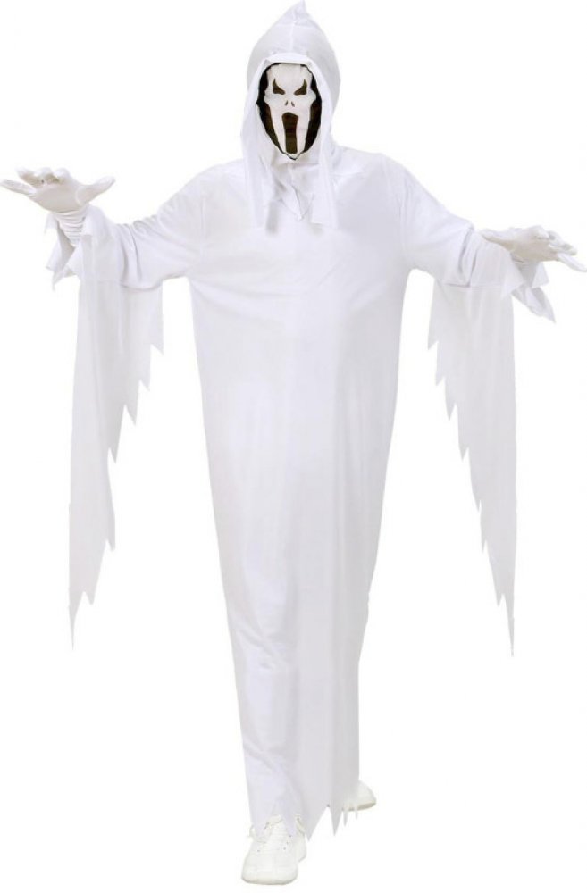 Dětský bílý karnevalový kostým ducha nebo strašidla. Halloweenský kostým. Velikost: 116cm, 4-5 let Materiál: 100% polyester Určeno pro: dětský Kostým obsahuje: šaty s kapucou a maskou Barva: bílá