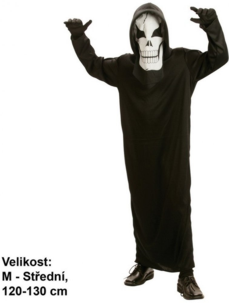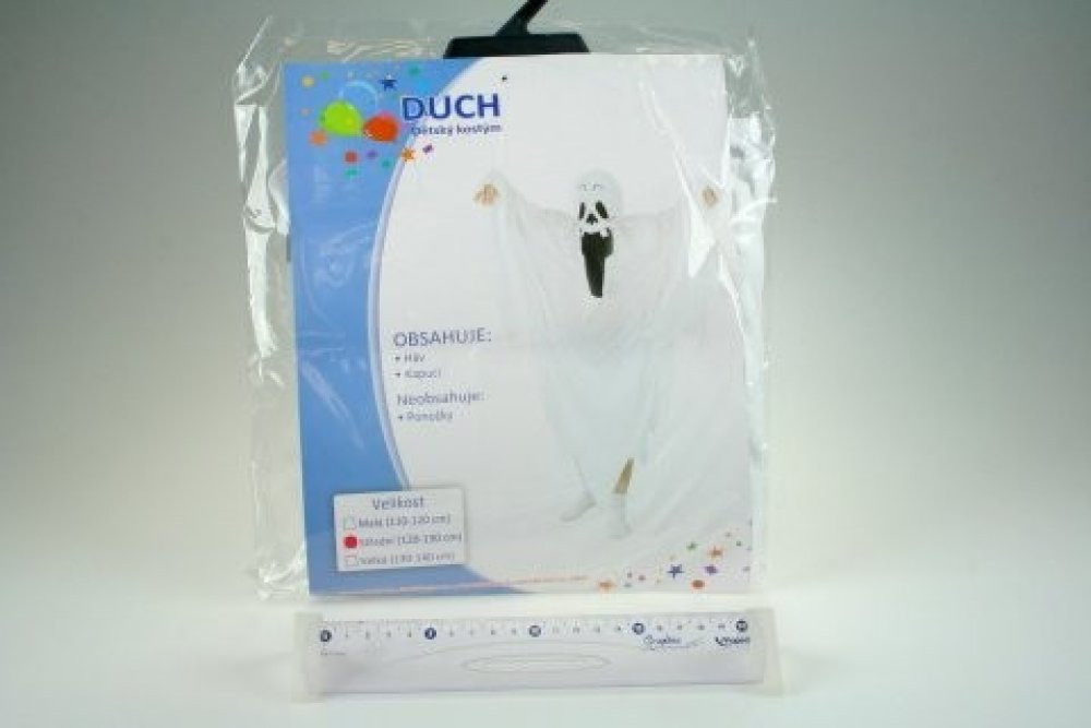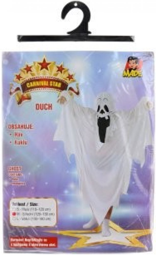 Karnevalový kostým - Duch. Velikost: Střední (120 - 130 cm). Kostým je vhodné pro děti ve věku 5-9 let. Obsahuje: háv, kapuci. Neobsahuje: ponožky. Rozměry balení cca 30x46x2 cm.