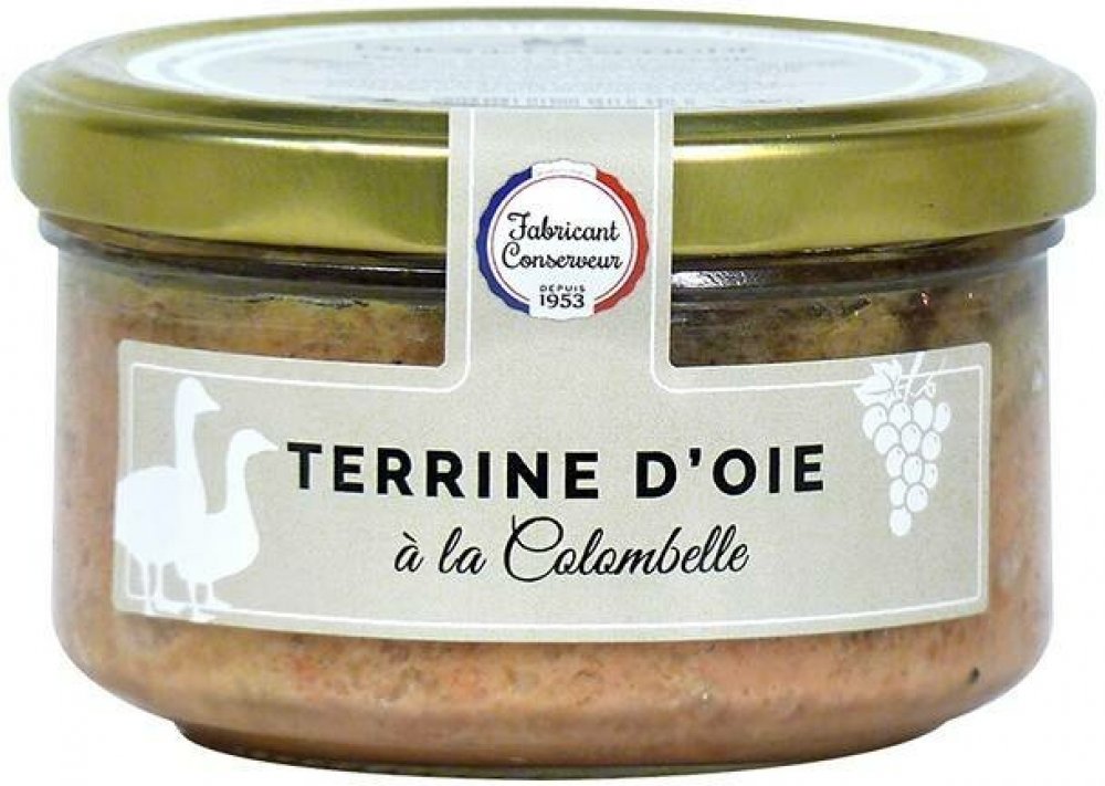 Složení: husí maso 27%, vepřové sádlo, vepřová a drůbeží játra, vejce, bílé víno Colombelle 3%, sůl, koření. Alergeny: vejce.