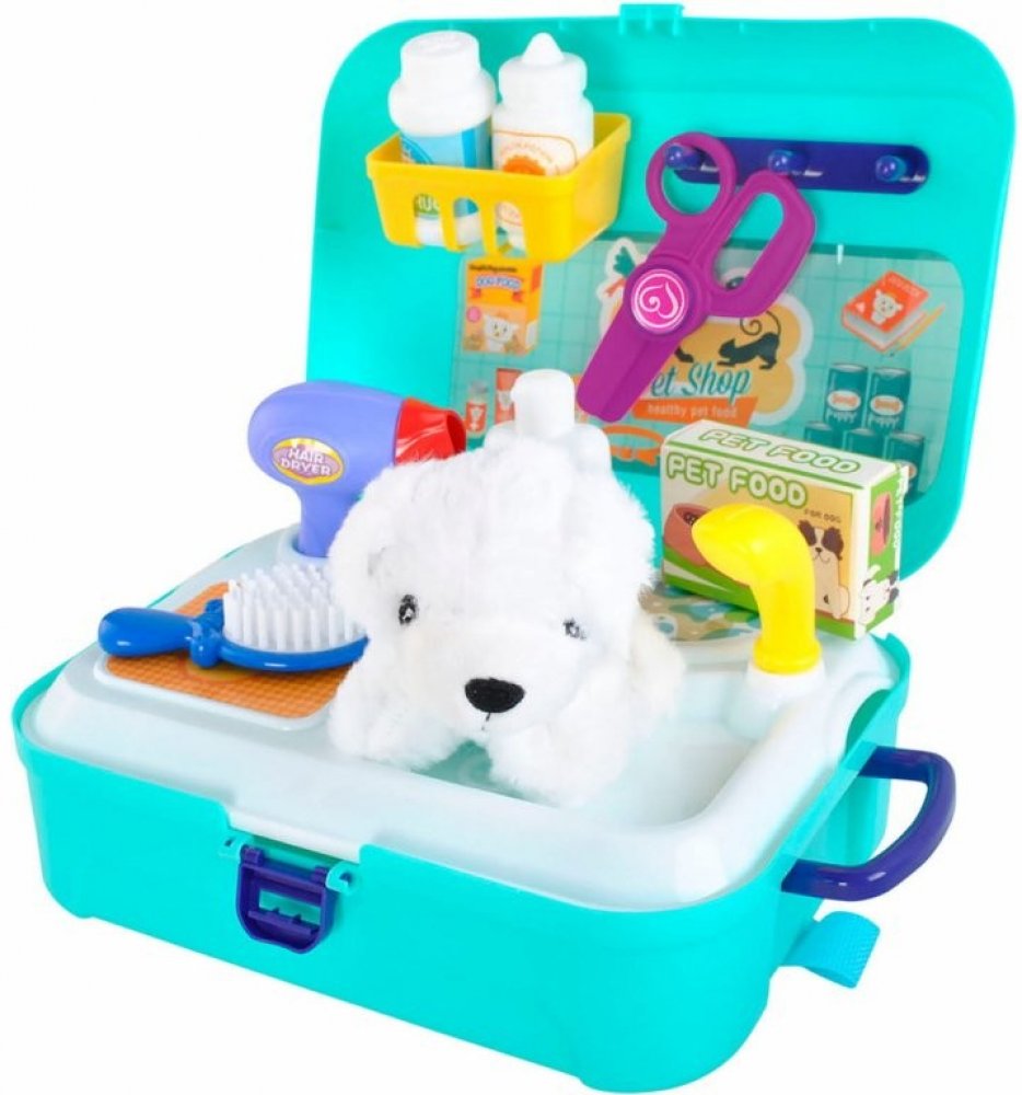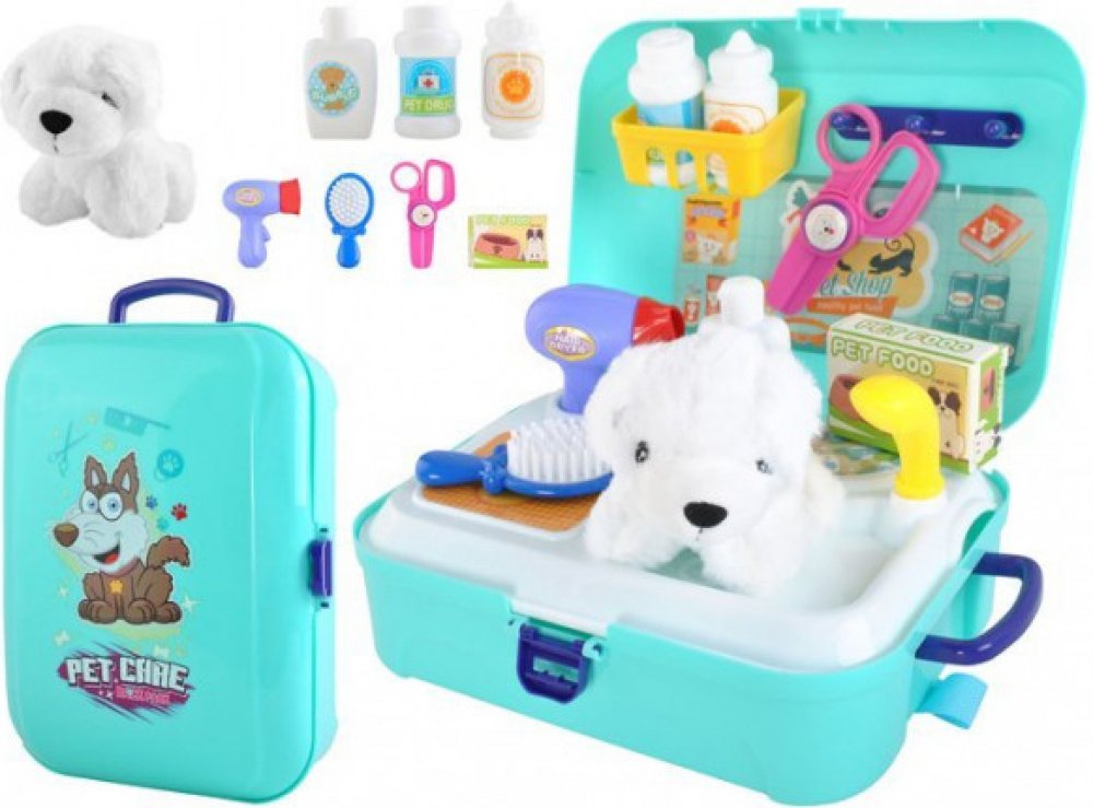 Celé sada je uzavřena v malém praktickém kufříkus úložným boxem,do kterého po skončení zábavy můžeme uložit všechno příslušenství. Kufřík má nastavitelné popruhy a pohodlnou rukojeť.Praktický kufřík s úložným prostoremTato hračka ukazuje dítěti, jak velkou odpovědností je vlastnit zvířátko. Seznamuje dítěte se základními postupy při péči o pejska (stříhání drápků, kartáčování, koupání…). Tuto sadu je vhodné pořídit, pokud si dítě už delší dobu přeje domácího mazlíčka.Technické specifikace:Rozměr kufříku: 24 x 18 x 8 cmMateriál: plastSada obsahuje: kufřík, plyšový pejsek, vanička se sprchou, fén, nůžky hřeben, krabička s jídlem, šampon, léky, polička