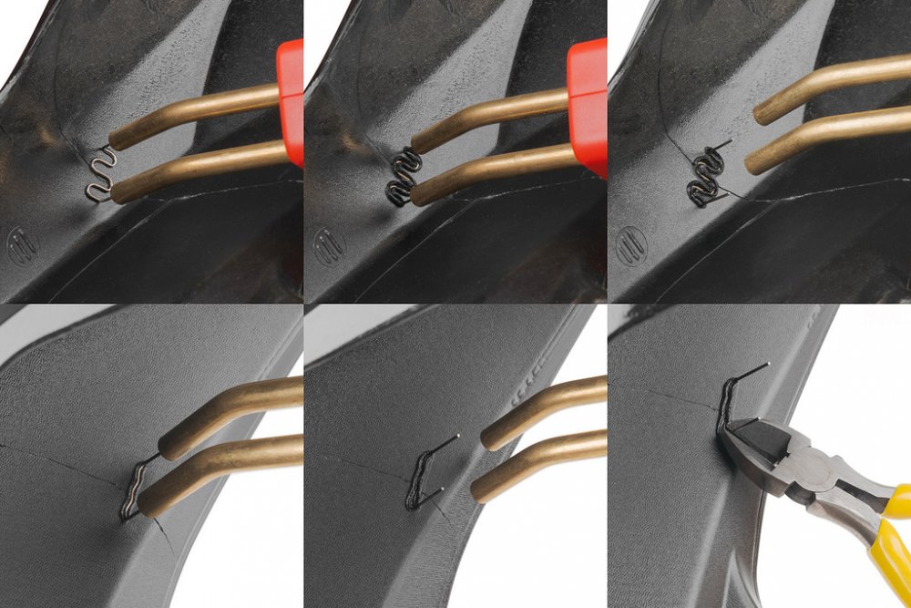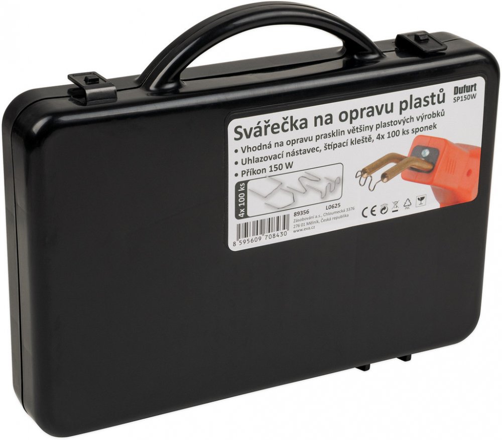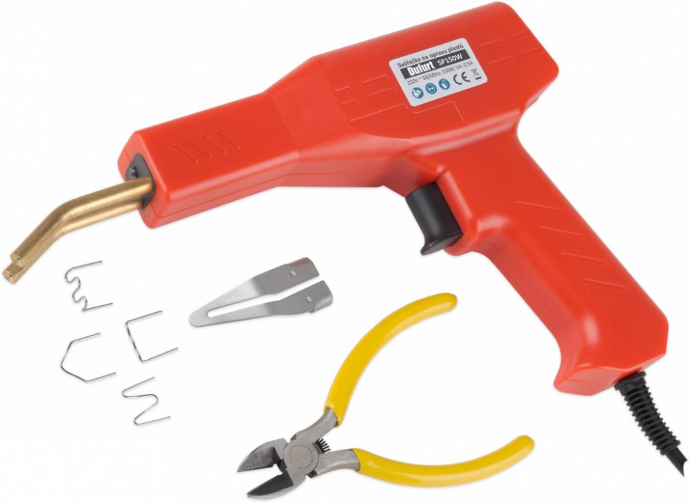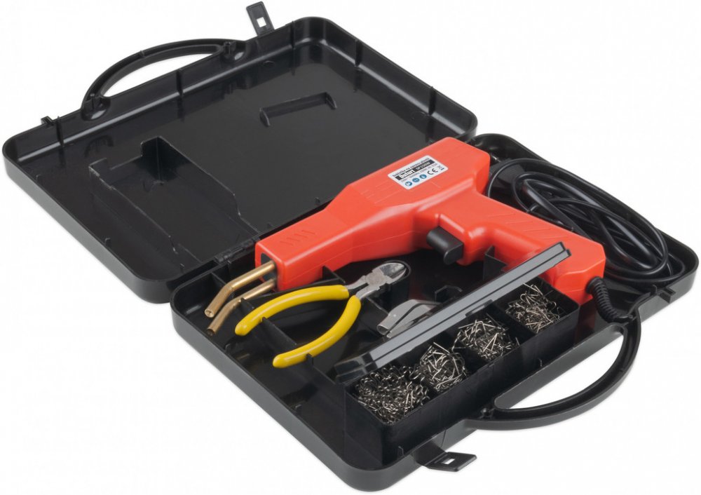 Elektrická svářečka plastů pro opravu prasklin plastových výrobků pomocí kovových sponek. Sponka se zataví do plastu a spojí prasklinu, pro uhlazení spoje slouží přiložený vyhlazovací nástavec, který taví a uhlazuje plastové spoje. Dodáváno v kufru. včetně 400 ks sponek různých tvarů (4 typy po 100 ks s průměrem nerezového drátu 0,8 mm) a štípacími kleštěmi. Vestavěné LED osvětlení pracovní plochy. Délka kabelu 1,5 m. Hmotnost 1,136 kg. Vstupní proud 0,5 A. Příkon 150 W.