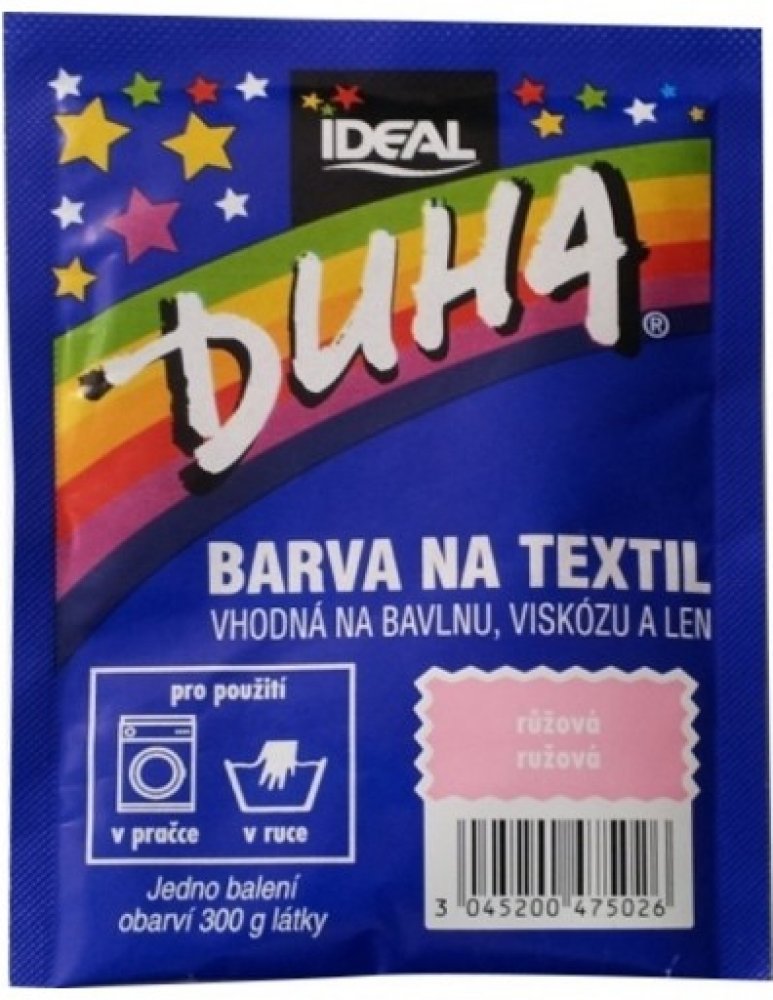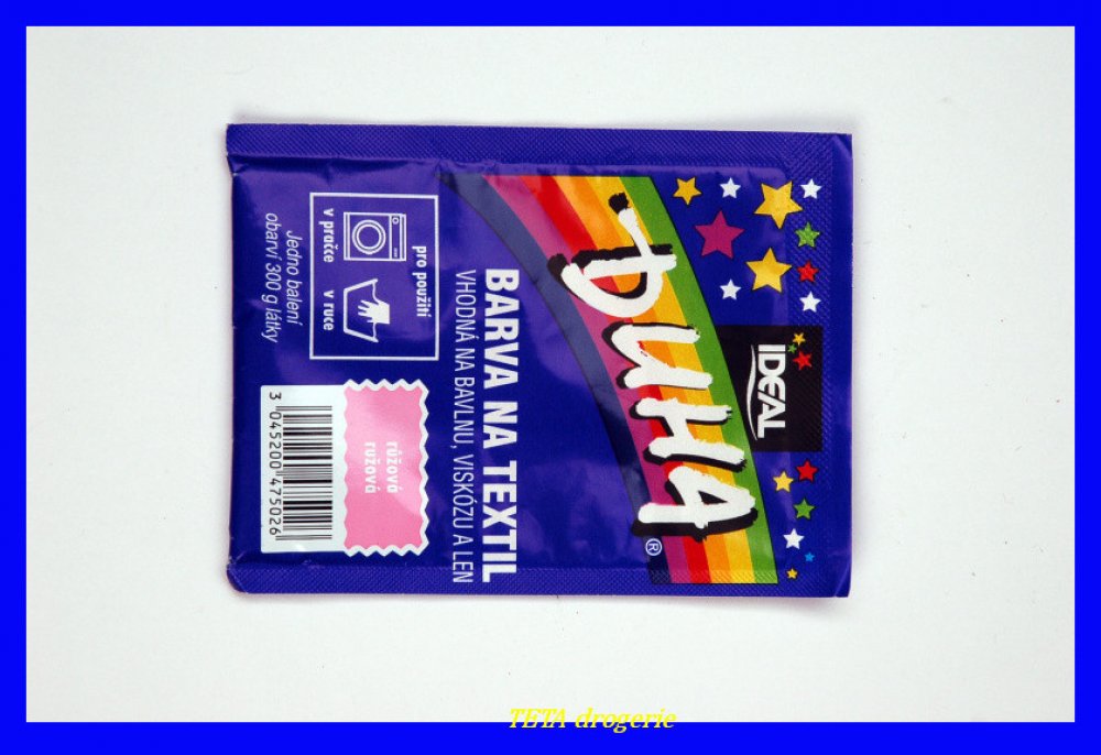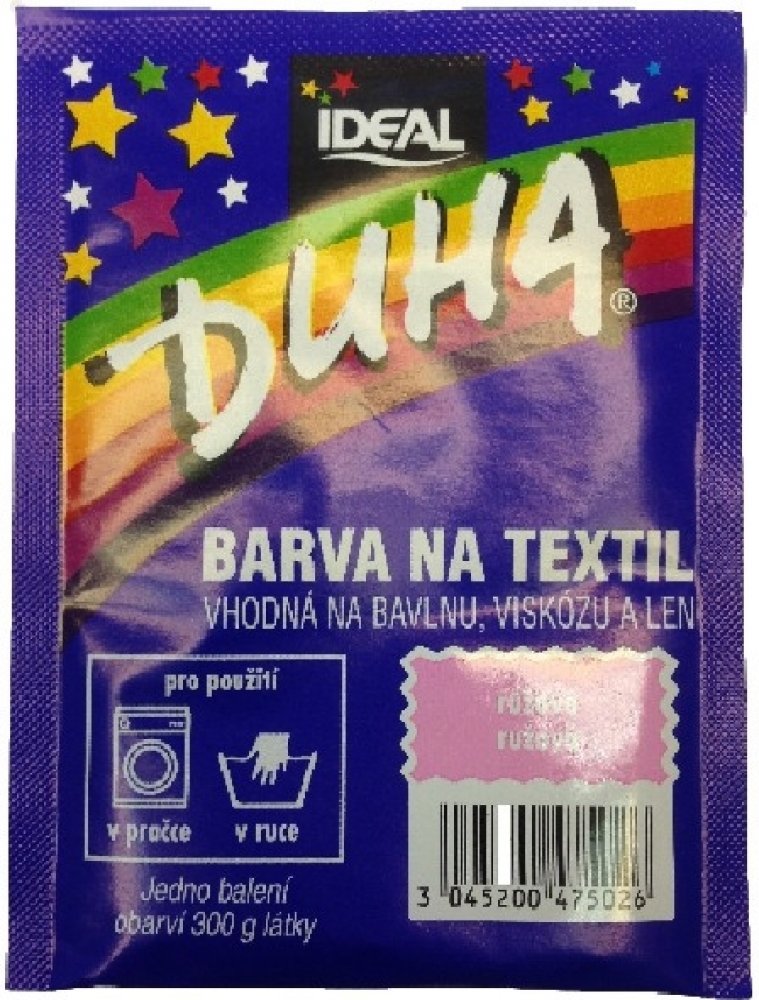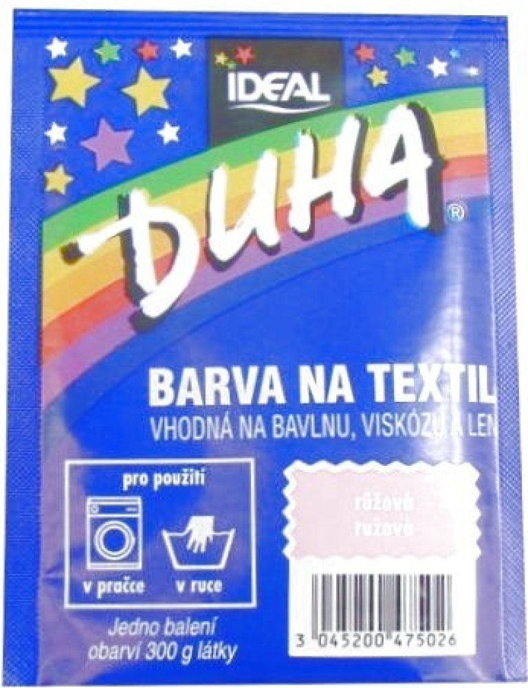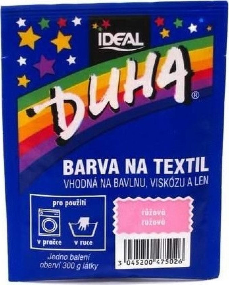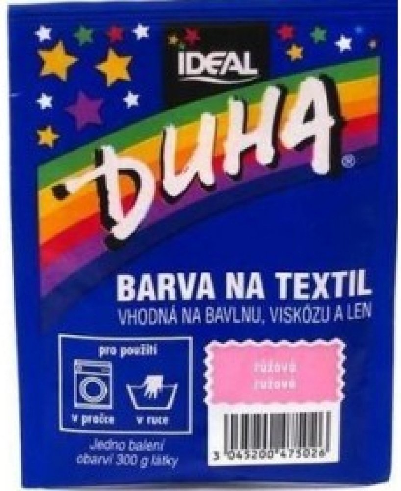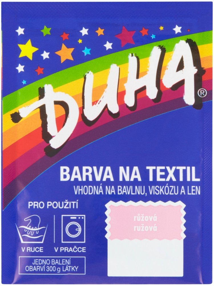 DUHA barvy na textil jsou určené ke změně barvy textilie. Jsou vhodné na barvení bavlny, viskózy a lnu. Lze je používat při barvení v ruce i v pračce. Barevná škála nabízí 15 barevných odstínů, které lze mezi sebou i míchat a vytvářet tak nepřebernou škálu barev.