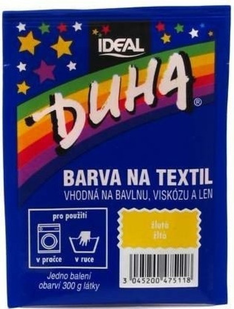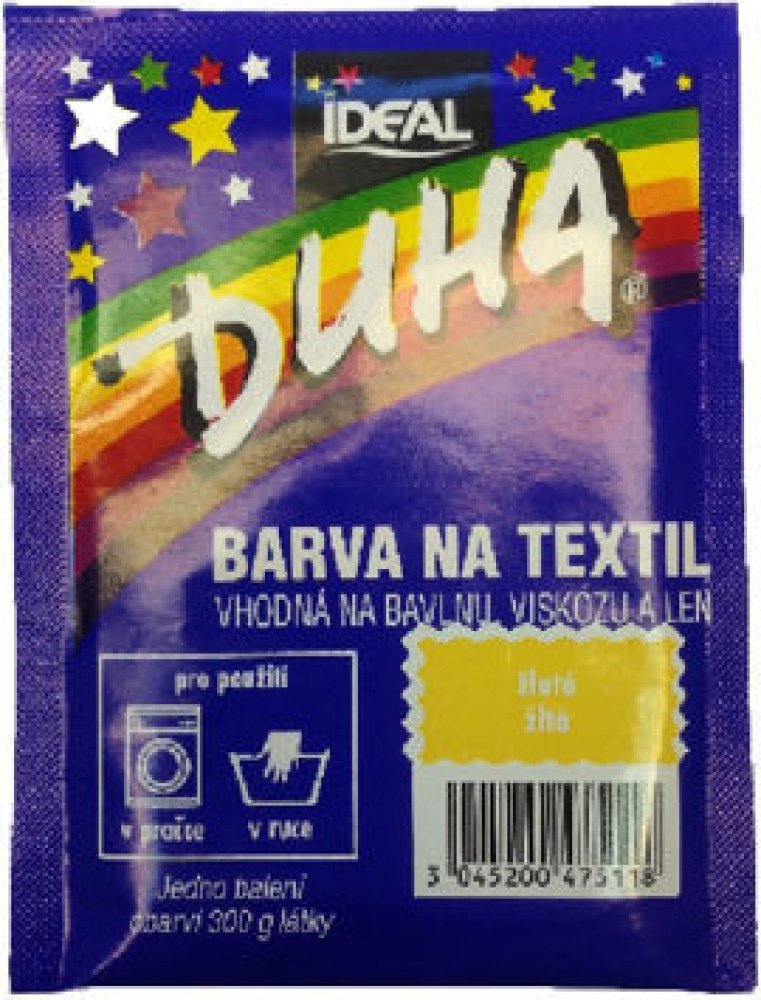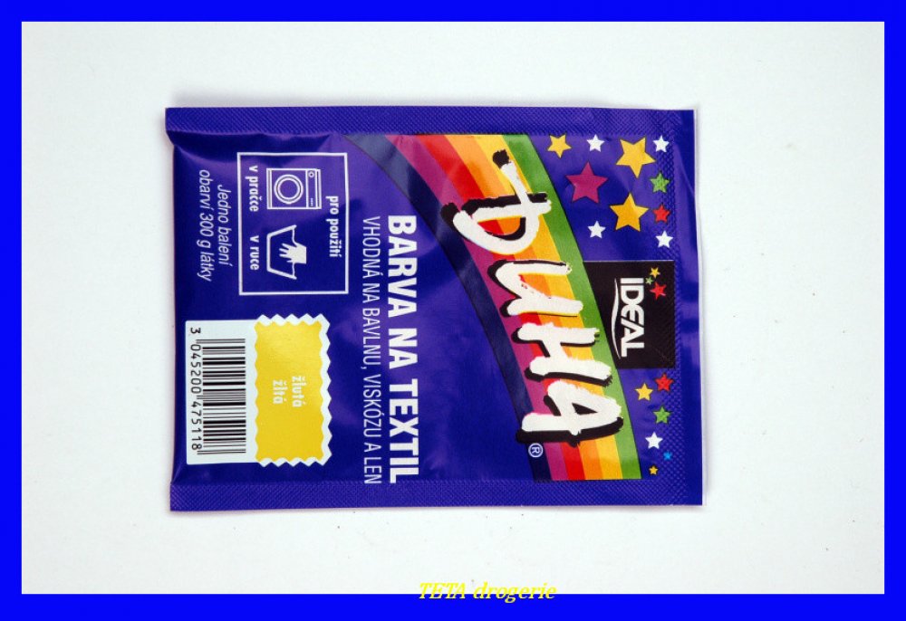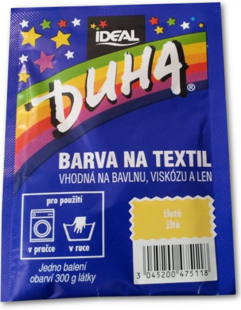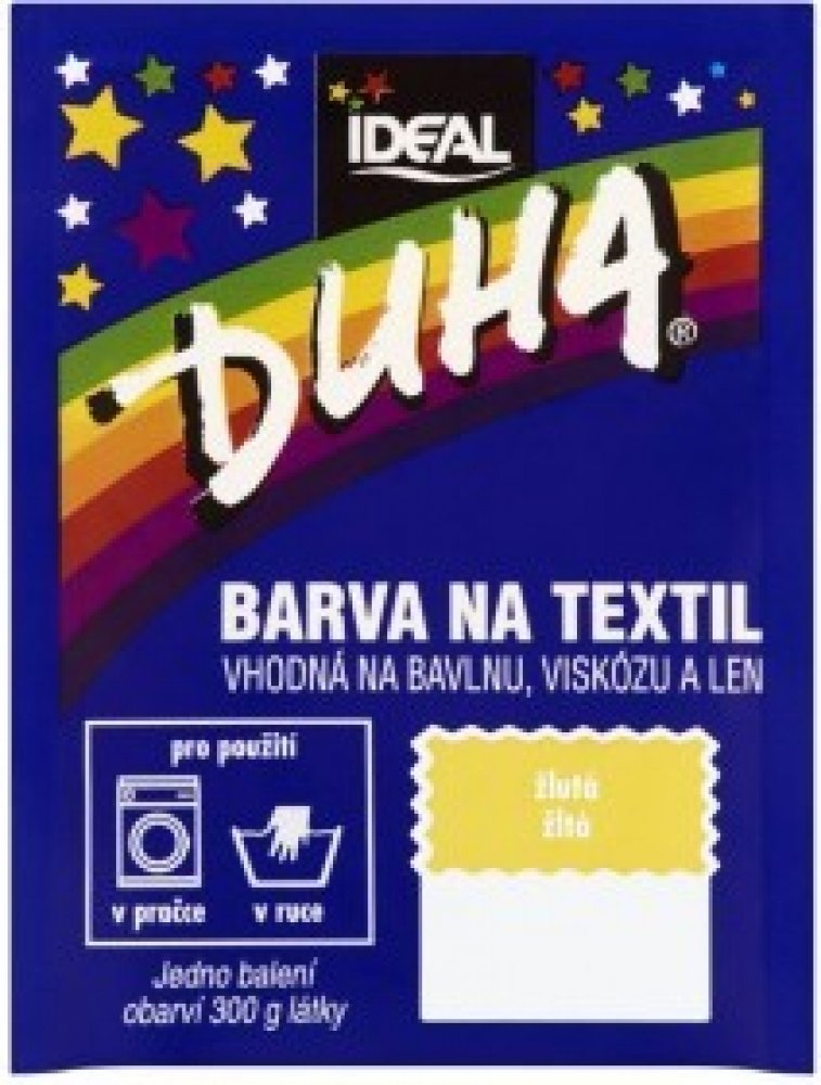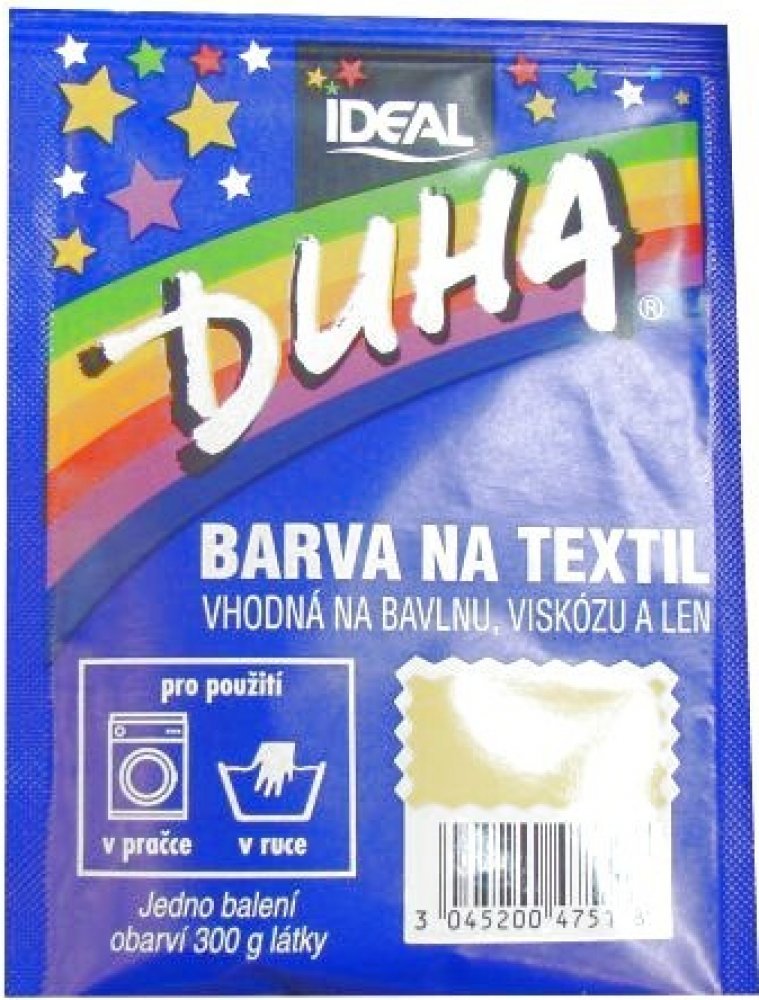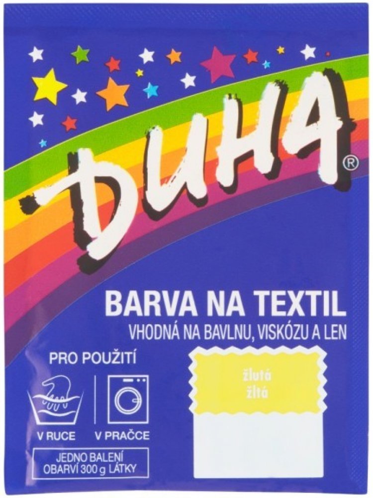 DUHA barvy na textil jsou určené ke změně barvy textilie. Jsou vhodné na barvení bavlny, viskózy a lnu. Lze je používat při barvení v ruce i v pračce. Barevná škála nabízí 15 barevných odstínů, které lze mezi sebou i míchat a vytvářet tak nepřebernou škálu barev.