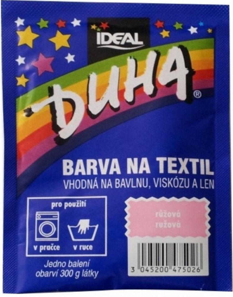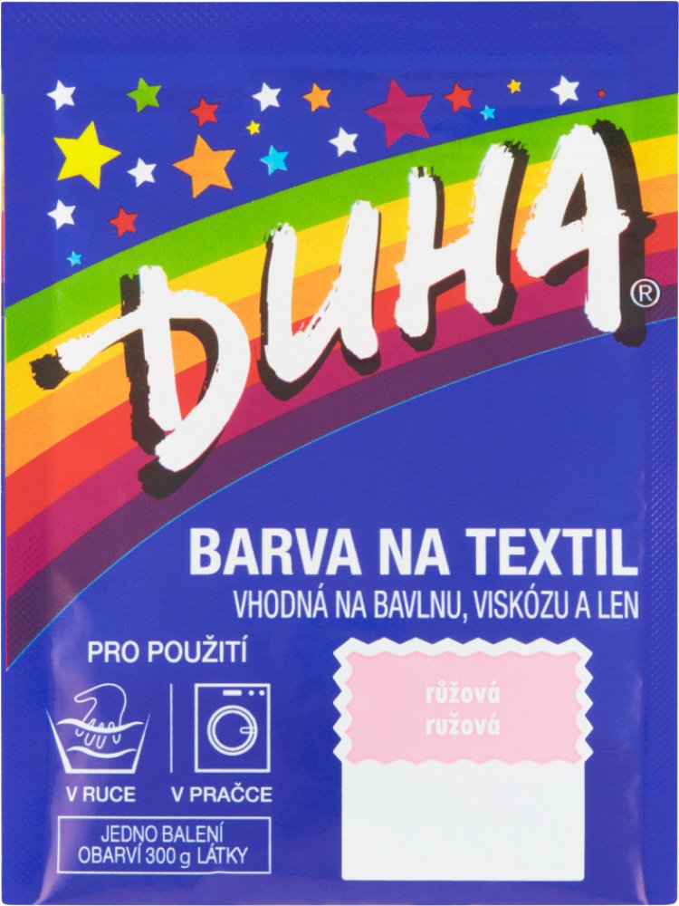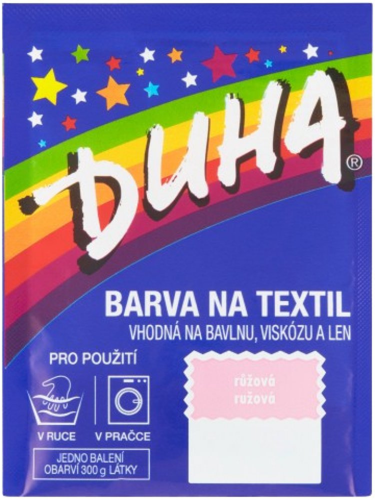 DUHA barvy na textil jsou určené ke změně barvy textilie. Jsou vhodné na barvení bavlny, viskózy a lnu. Lze je používat při barvení v ruce i v pračce. Barevná škála nabízí 14 barevných odstínů, které lze mezi sebou i míchat a vytvářet tak nepřebernou škálu barev.