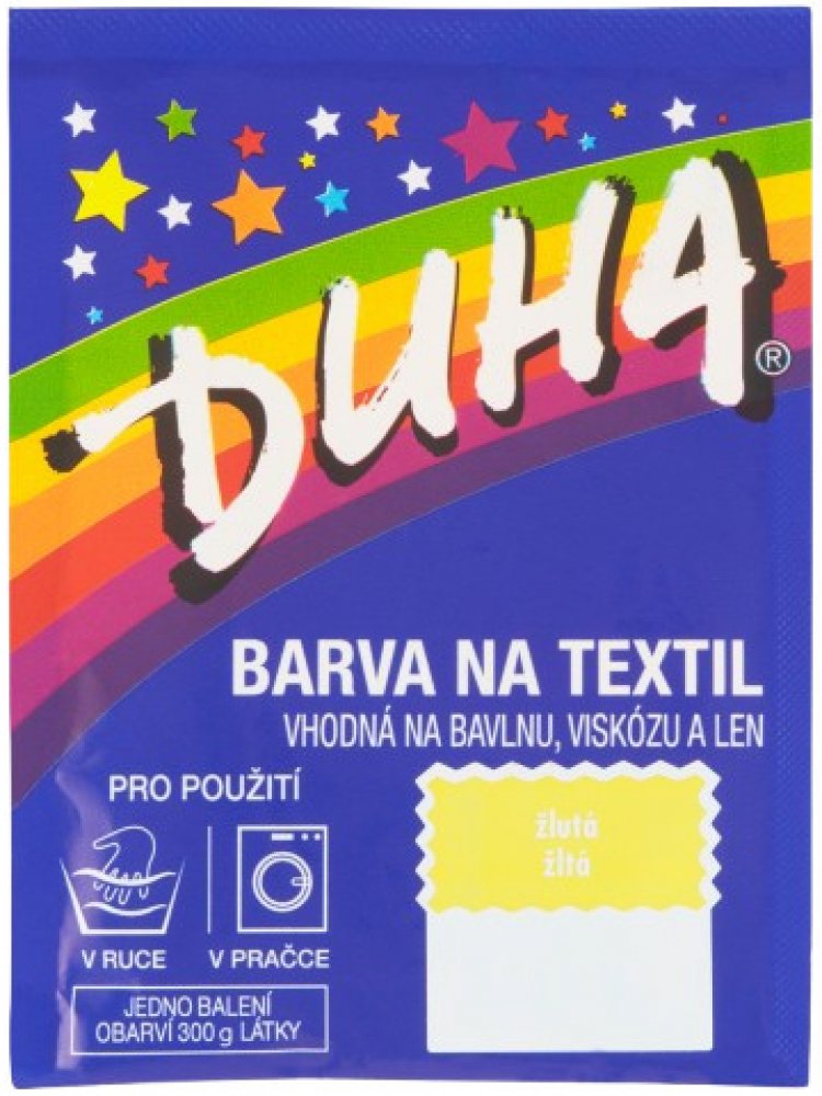 Barva na textil vhodná na bavlnu, viskózu a len. Pro použití v pračce či v ruce. Jedno balení obarví 300 g látky. Barvení v ruce: Obsah sáčku rozpusťte ve 1/4 l vroucí vody. Roztok nalijte do nádoby se 7-10 litry vlažné vody a přidejte 10 polévkových lžic kuchyňské soli (200 g). Ponořte barvenou látku do lázně, rovnoměrně rozprostřete a za občasného míchání přiveďte k varu. Udržujte takto při mírném varu 20 minut, potom odstavte a občas zamíchejte, až voda téměř vychladne. Barvenou látku potom máchejte ve studené vodě, dokud není voda čirá. Barvení v automatické pračce: Obsah sáčku rozpusťte ve 1/4 l vroucí vody a nalijte přímo do bubnu pračky. Přidejte 10 polévkových lžic kuchyňské soli (200 g). Vložte látku do bubnu a použijte program s nejvyšší teplotou (80-90°C) bez předpírání. Po ukončení cyklu látku vyjměte. Čištění pračky: Pro odstranění možných zbytků barvy nastavte program s nejvyšší teplotou (80-90°C). Přidejte do pračky minimální dávku pracího prášku a 200 ml bělícího přípravku (např. Savo Perex) spolu s kusem staré látky, který případné zbytky barvy pohltí. Bezpečnostní upozornění GHS07 - dráždivé látky Signální slovo: Varování H315 Dráždí kůži. H319 Způsobuje vážné podráždění očí. H412 Škodlivý pro vodní organismy, s dlouhodobými účinky. P101 Je-li nutná lékařská pomoc, mějte po ruce obal nebo štítek výrobku. P102 Uchovávejte mimo dosah dětí. P280 Používejte ochranné rukavice/ochranný oděv/ochranné brýle/obličejový štít. P301+P310 PŘI POŽITÍ: Okamžitě volejte TOXIKOLOGICKÉ INFORMAČNÍSTŘEDISKO/lékaře/ tel. 224 919 293 nebo 224 915 402 (24 hodin denně) P302+P352 PŘI STYKU S KŮŽÍ: Omyjte velkým množstvím vody a mýdla P305+P351+P310 PŘI ZASAŽENÍ OČÍ: Několik minut opatrně vyplachujte vodou. Vyjměte kontaktníčočky, jsou-li nasazeny a pokud je lze vyjmout snadno. Pokračujte vevyplachování.
