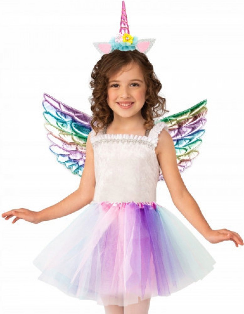 Dětský kostým v designu duhového jednorožce s křídly. Tato pohádková sada je dokonalým způsobem, jak přivést magii a kouzlo do hry a proměnit vaše dítě na skutečného jednorožce. Tato sada je ideální pro dětské párty, bsp;jako skvělý námět pro rodinné nebo dětské fotografie. Díky kvalitnímu zpracování bude vaše dítě v tomto kostýmu vypadat a cítit se skvěle. Součástí sady je čelenka s rohem, sukýnk...