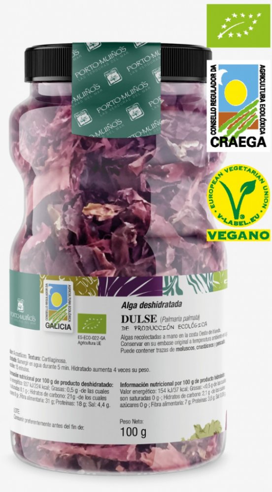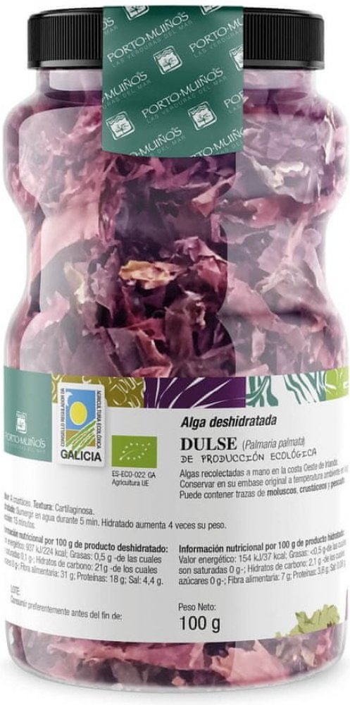 Porto-Muiños Dulse BIO (100 g) – jedlá mořská řasa s jemně slanou „umami“ chutí, přirozeným obsahem minerálů a vlákniny – skvělá do salátů, polévek i jako rychlé koření do hotových jídel.