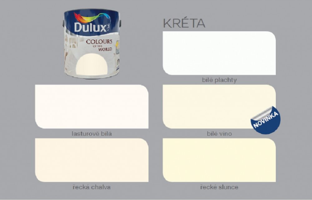 Barva Dulux Colours of the World je disperzní akrylátová barva s matným povrchem určená pro interiérové dekorační a ochranné nátěry stěn a stropů. Je možné ji použít na cementové nebo vápenocementové omítky, sádrové podklady, sádro...
