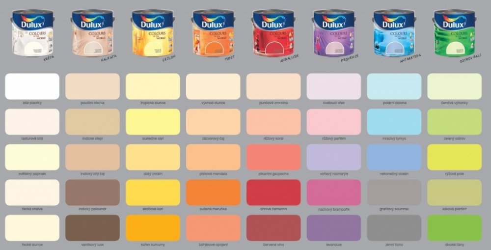 Podrobnosti o produktu 5163265 Dulux Colours of the World je kolekce 45 odstínů, které se inspirují nejkrásnějšími světovými zákoutími a byly vybrány ve spolupráci se světovými i českými designéry. Splňují nejnáročnější požadavky na snadnou kombinovatelnost s respektem k tradicím, ale i zároveň moderním trendům.