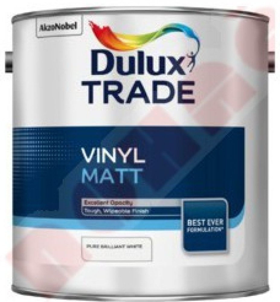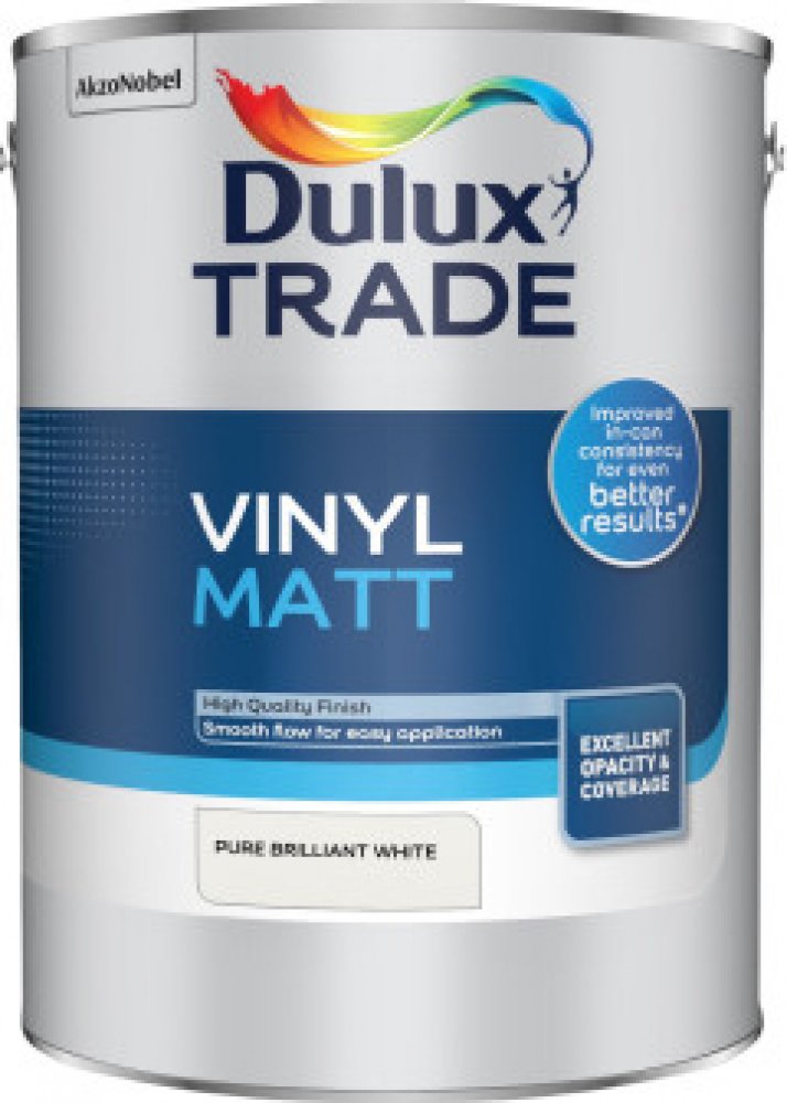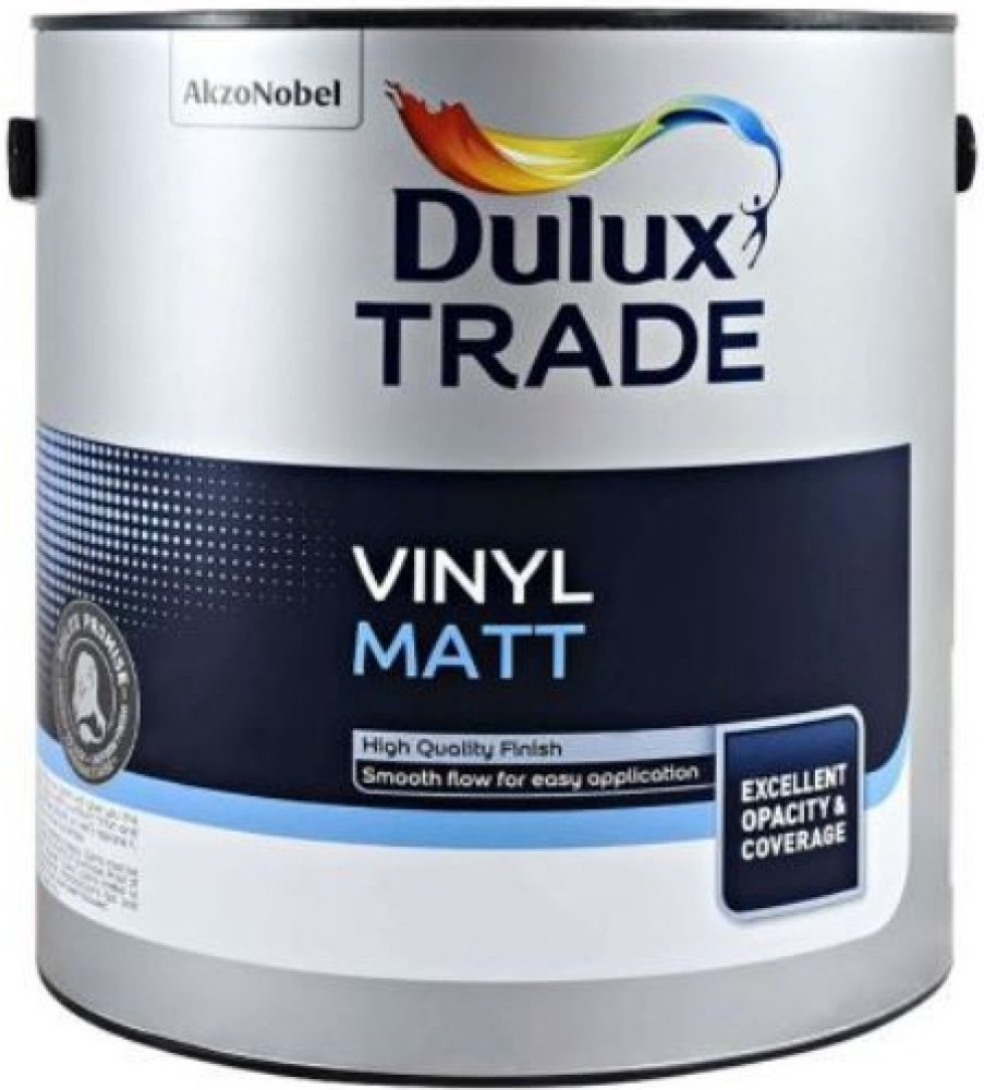 Dulux Vinyl Matt je matná interiérová barva prémiové kvality pro použití na sádro-karton, omítku, beton, umakart, dřevotřísku, vinylové expandované tapety a řadu různých obkládacích desek. Nátěr má výbornou prodyšnost a trvanlivost. Snáší jemné mytí. Pro oblasti silně zatěžované vodou nebo kondenzací vodních par použijte Diamond Eggshell nebo Sterishield Diamond Matt. Lze tónovat dle barevné vzornkovnice Dulux Trade Colour Card.