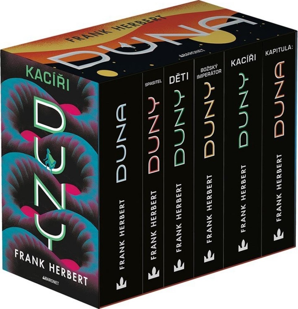 Původní série Duna v jednom boxu!Kdo ovládá Arrakis, ovládá vše!Příběh Duny se odehrává v daleké budoucnosti v mezihvězdném impériu, kterému vládne padišáh imperátor Shaddam IV. z rodu Corrino, jemuž jsou podřízené všechny velkorody. Mladý Paul Atreides – dědic a následovník rodu Atreidů – odlétá se svým otcem vévodou Letem a matkou Jessikou na Arrakis, pouštní planetu, jež je jediným zdrojem výjimečného koření, nejdůležitější a nejcennější látky ve vesmíru s podivuhodnými vlastnostmi. Rod Atreidů má planetu spravovat poté, co ji opustili jejich odvěcí nepřátelé, Harkonnenové. A v tu chvíli se rozbíhá mnohovrstvá interakce složitého světa politiky, náboženství, ekologie, technologie a lidských emocí, to vše ve snaze ovládnout Arrakis, protože ten, kdo ovládá Arrakis, ovládá i koření...