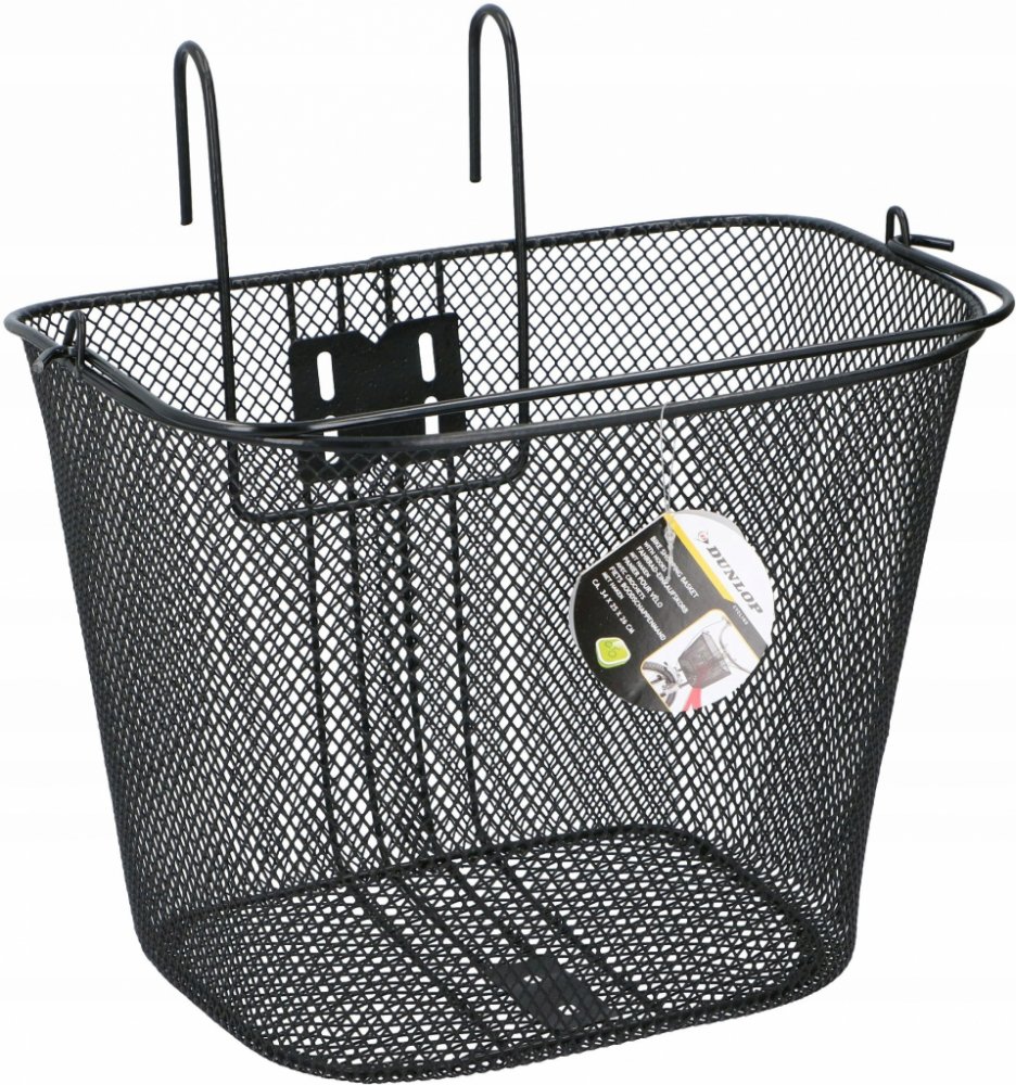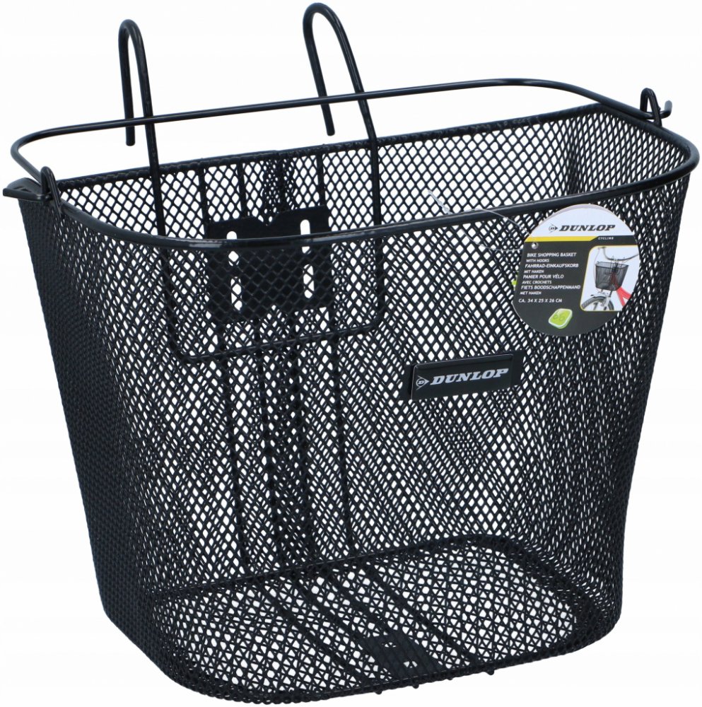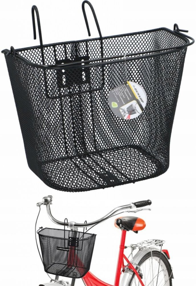KOŠÍK NA KOLO DUNLOP NA PŘEDNÍ STRANU NA HÁKY je vyroben z práškově lakované oceli, má objem přibližně 20 l, vyznačuje se vysokou pevností a odolností proti deformaci, četné drobné očka v síti zajistí, aby drobné předměty během jízdy nevypadly.