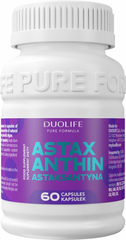 DUOLIFE Astaxanthin je doplněk stravy z řady Pure Formula obsahující astaxanthin přírodního původu v koncentrované dávce získaný z řas Haematococcus pluvialis. Je uzavřen v kapslích s derivátem organické celulózy (HPMC) s postupným uvolňováním.