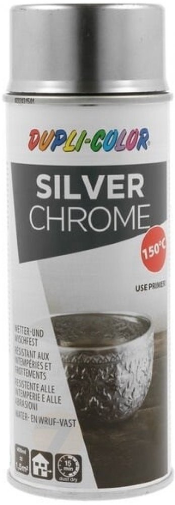 DUPLI-COLOR stříbrný chrom je vysoce lesklý efektivní sprej pro hladké povrchy, který dává vzhled podobný chromu. Díky nové kvalitě, kterou je odolnost proti otěru a povětrnostním vlivům, může být sprej použit na venkovní účely.