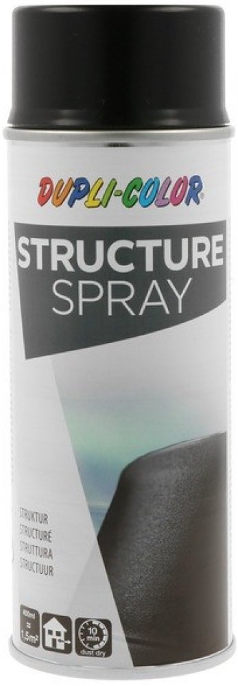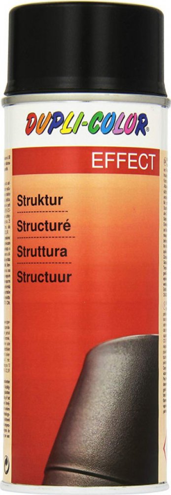 Strukturní dekorační sprej na nitro-kombi bázi Dupli-Color Effect o objemu 400 ml v černé barvě je určený pro opravu a obnovení struktury opravených nebo vyplněných plastů. Jeho použití je vhodné i na ruční práce a domácí dekorace. Sprej je aplikovatelný na sklo, dřevo, kov, kámen, lepenku či tvrdé plasty. Použití je možné jak v interiéru, tak i v exteriéru. V obou případech disponuje odolností vůči povětrnostním vlivům, poškrábání, stírání, UV záření a světlu. Sprej vykazuje výbornou přilnavost a lze ho přetřít akrylovým sprejem Dupli-Color. Před použitím se doporučuje nádobku důkladně protřepat a aplikovat několik tenkých vrstev v minimální vzdálenosti cca 25 cm. Tento dekorační sprej je rychleschnoucí a zanechává saténový lesk s vynikající retencí barev.