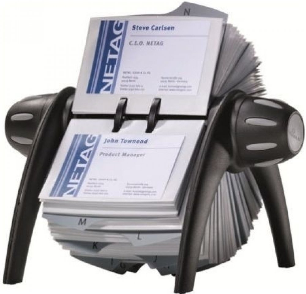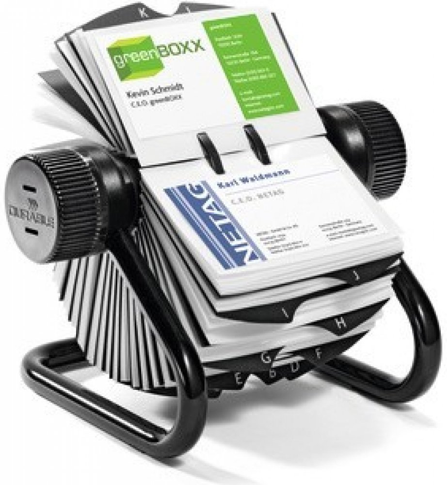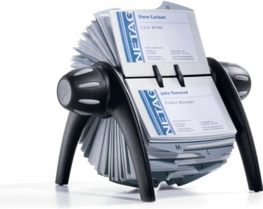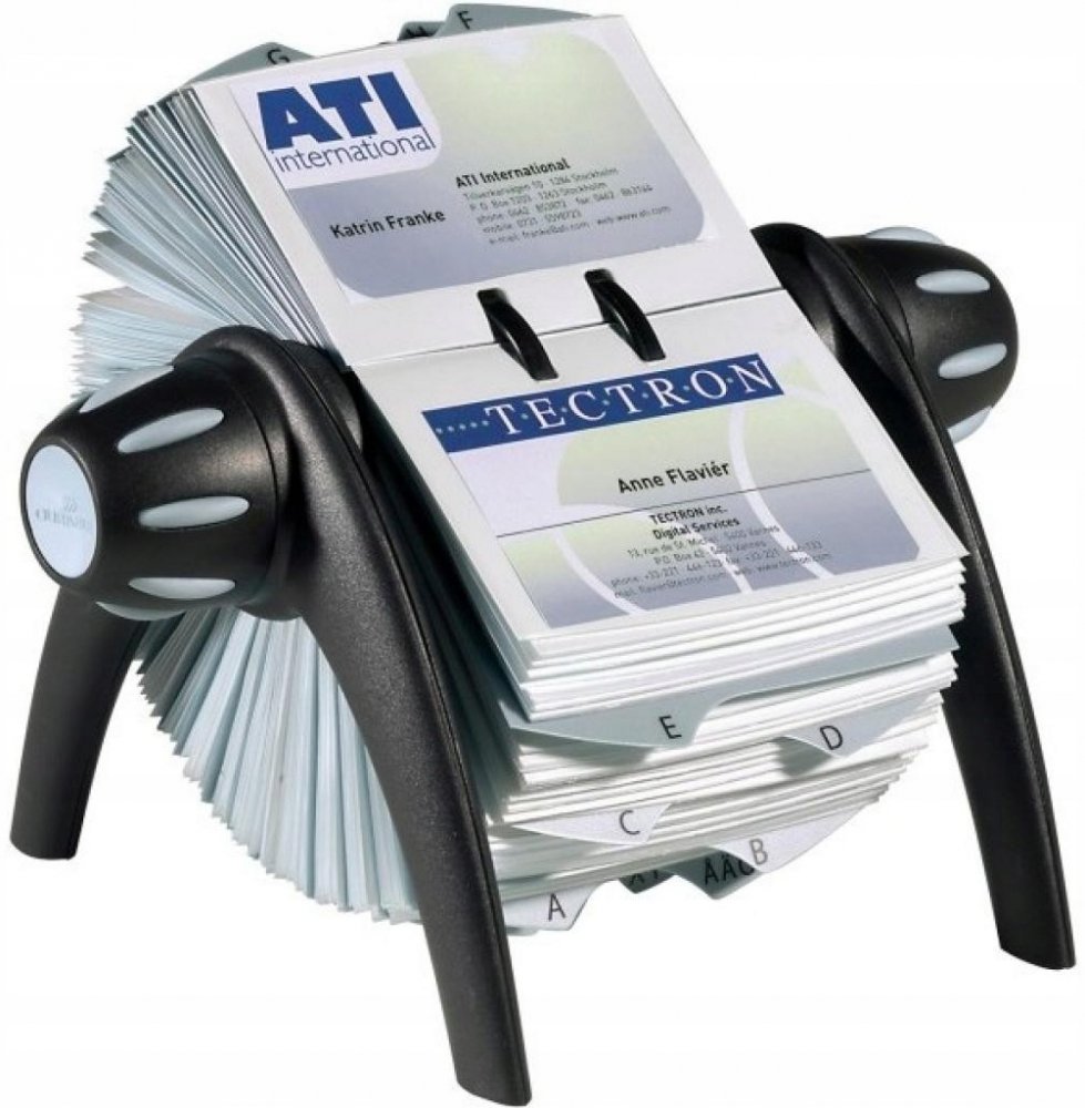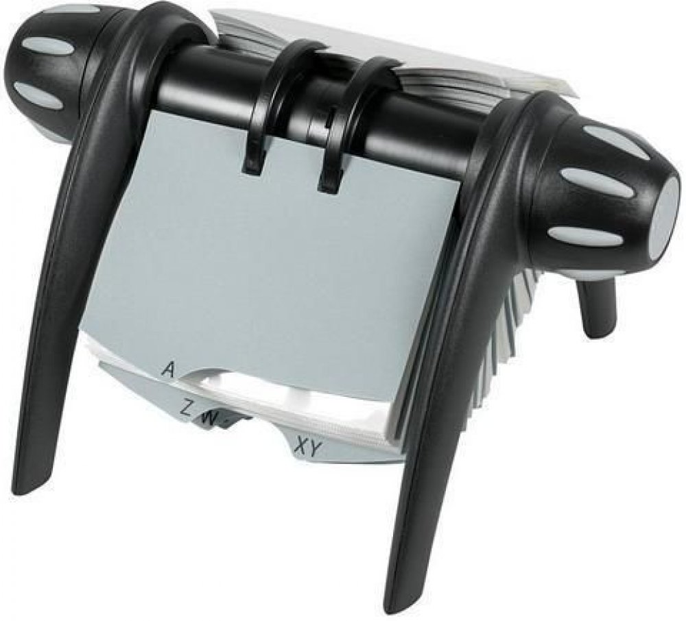 Rotační index pro ukládání vizitek. Dodává se s 200 kapsami na vizitky do maximální velikosti 104x72 mm pro 400 karet. Kompletní s indexem 25 dílů A-Z. Poskytuje rychlý a jednoduchý přístup ke kartám díky speciálnímu otočnému mechanismu. Snadné vyjmutí a vkládání kapes.