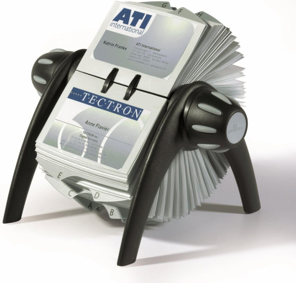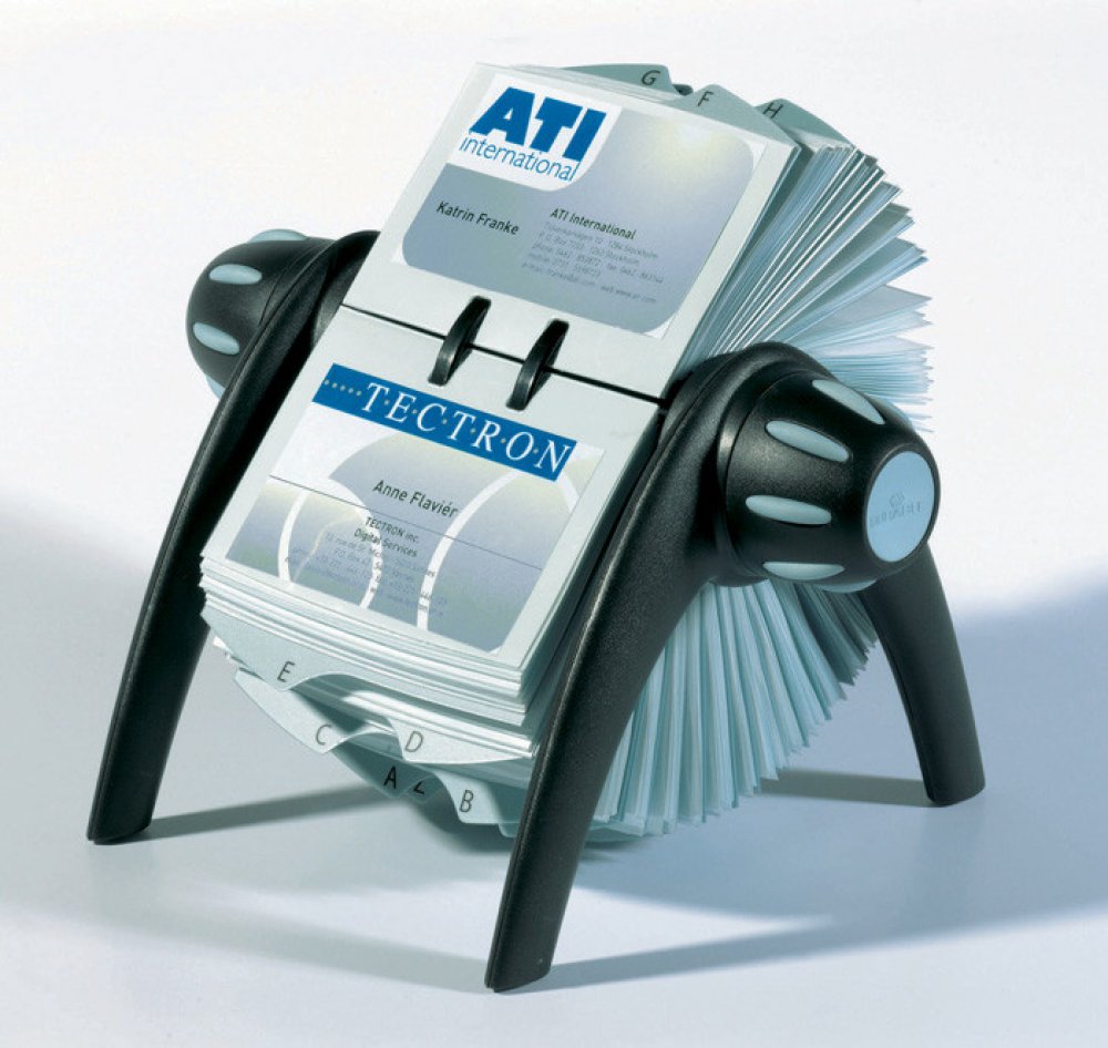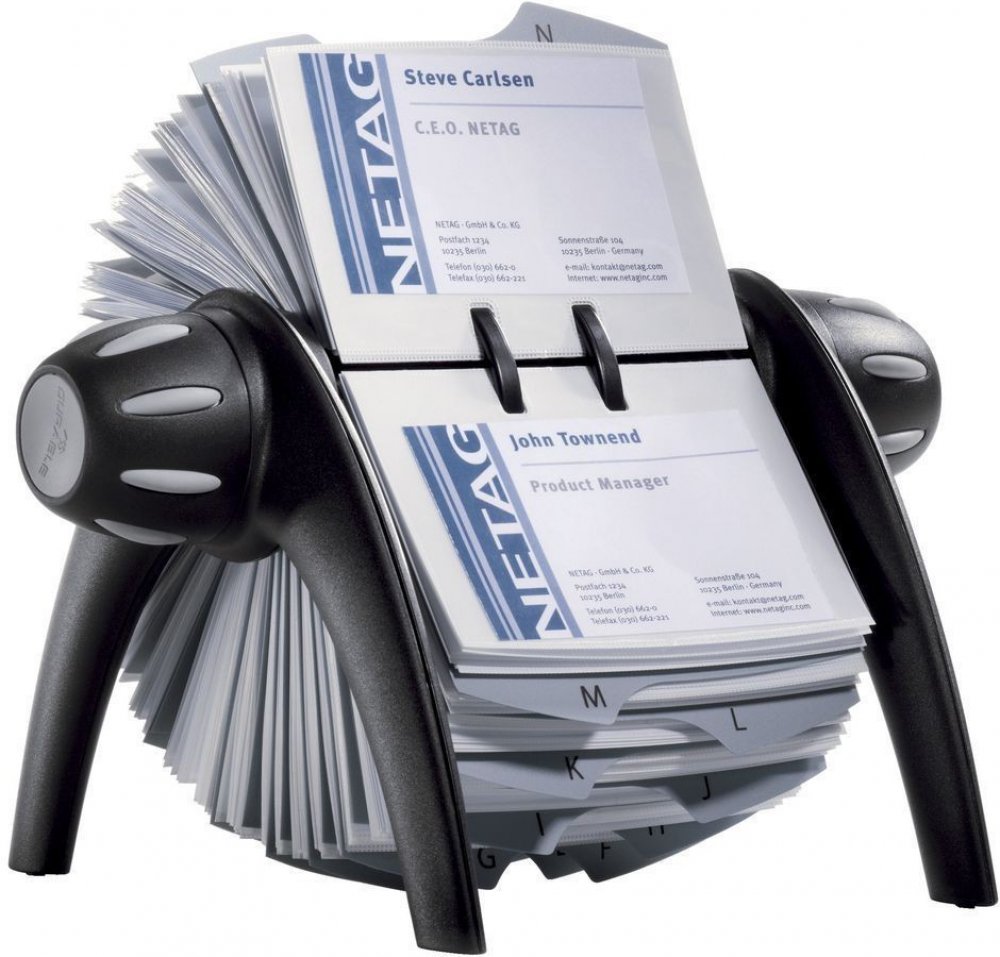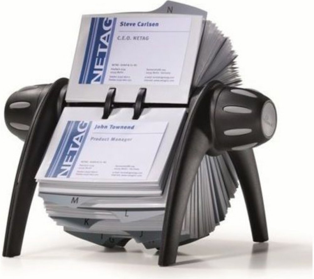 Rotační index pro ukládání vizitek. Dodává se s 200 kapsami na vizitky do maximální velikosti 104x72 mm pro 400 karet. Kompletní s indexem 25 dílů A-Z. Poskytuje rychlý a jednoduchý přístup ke kartám díky speciálnímu otočnému mechanismu. Snadné vyjmutí a vkládání kapes.