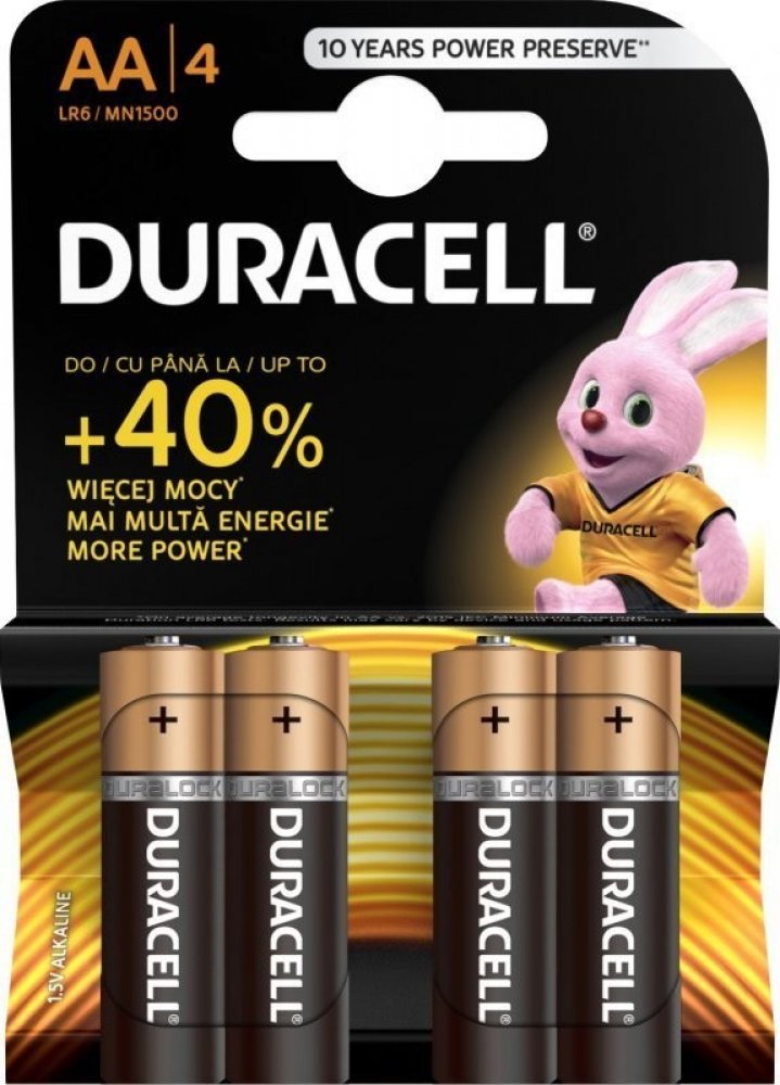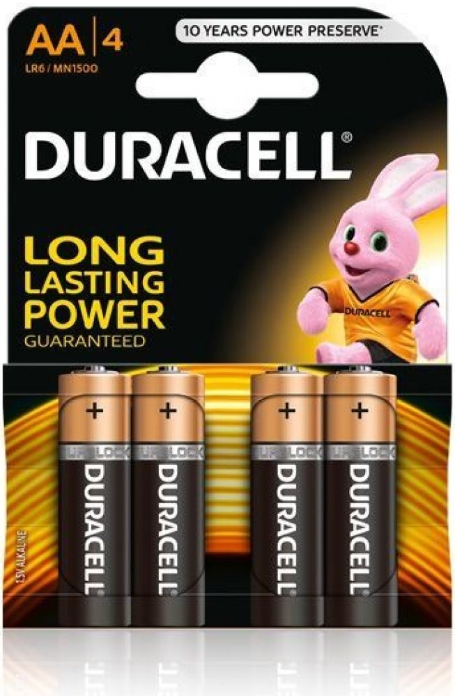 Baterie Duracell Basic jsou víceúčelové alkalické baterie vhodné pro běžné přístroje. Dokonalé uzavření horní části nylonem pomáhá předcházet vytečení baterií. Technologie Duralock udržuje nepoužívané baterie Duracell při běžném skladování jako nové a nabité po dobu až 10 let. Balení obsahuje 4 kusy baterií.