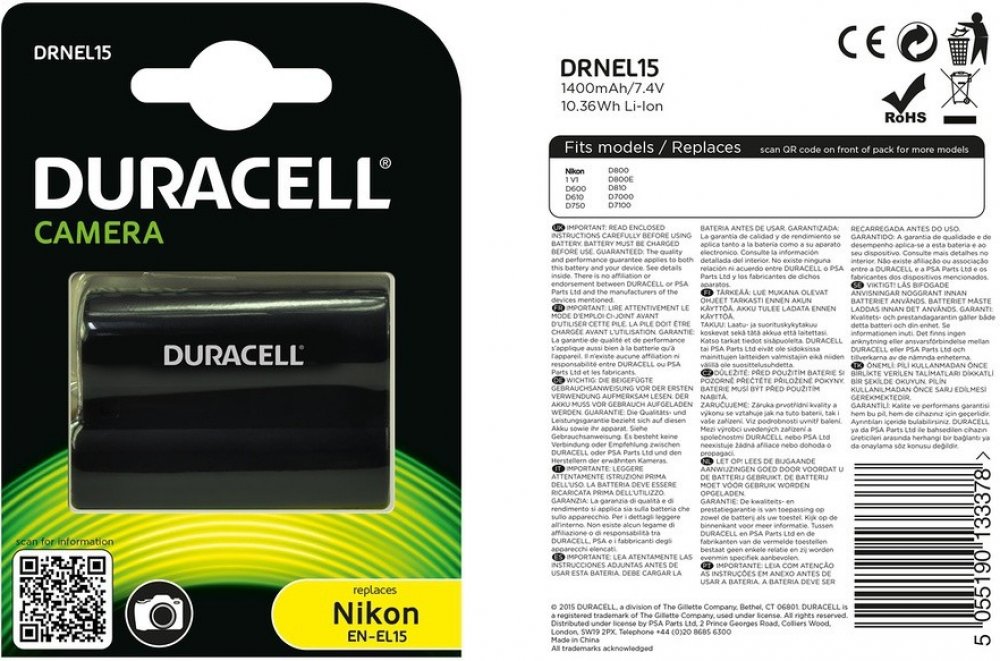 This high-quality Duracell original camera battery will see you snapping again in no time at all. The Duracell multi-fit camera battery provides long-lasting lithium-ion power for a range of camera makes and models, allowing hundreds of photos to be taken on a single charge. Duracell digital camera and camcorder batteries are built to the highest possible standards - something you would expect from such a respected brand. Each battery has a 2-year limited warranty, protecting you whatever happens. SPECIFICATIONS PSA PNo: DRNEL15 Warranty 2 Years Function battery performs Camera , Power battery for cameras Battery Chemistry Lithium ion , Newer type of rechargable, giving best performance for a rechargable. Number of Cells in Battery 2 Cells Voltage 7,4 V Capacity 1600 mAh Watt hours 11 Wh Weight 78 g Dimensions 55 mm x 39 mm x 20 mm Shape Rectangular Colour Black Brand Name Duracell branded product.
