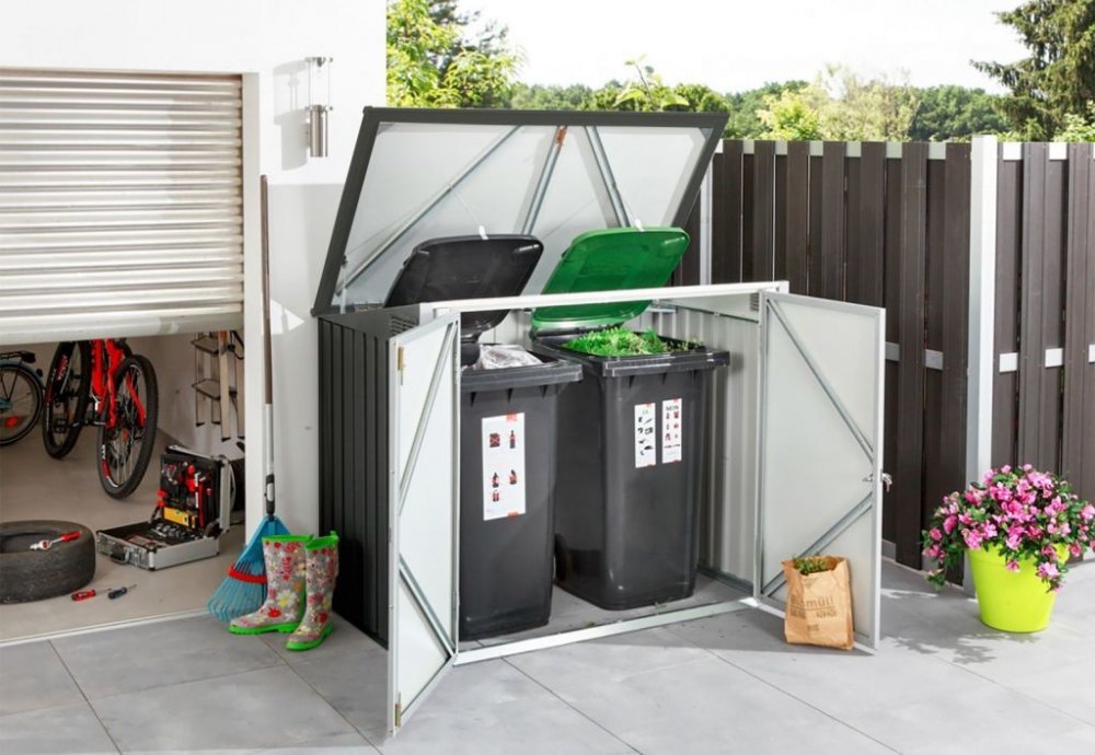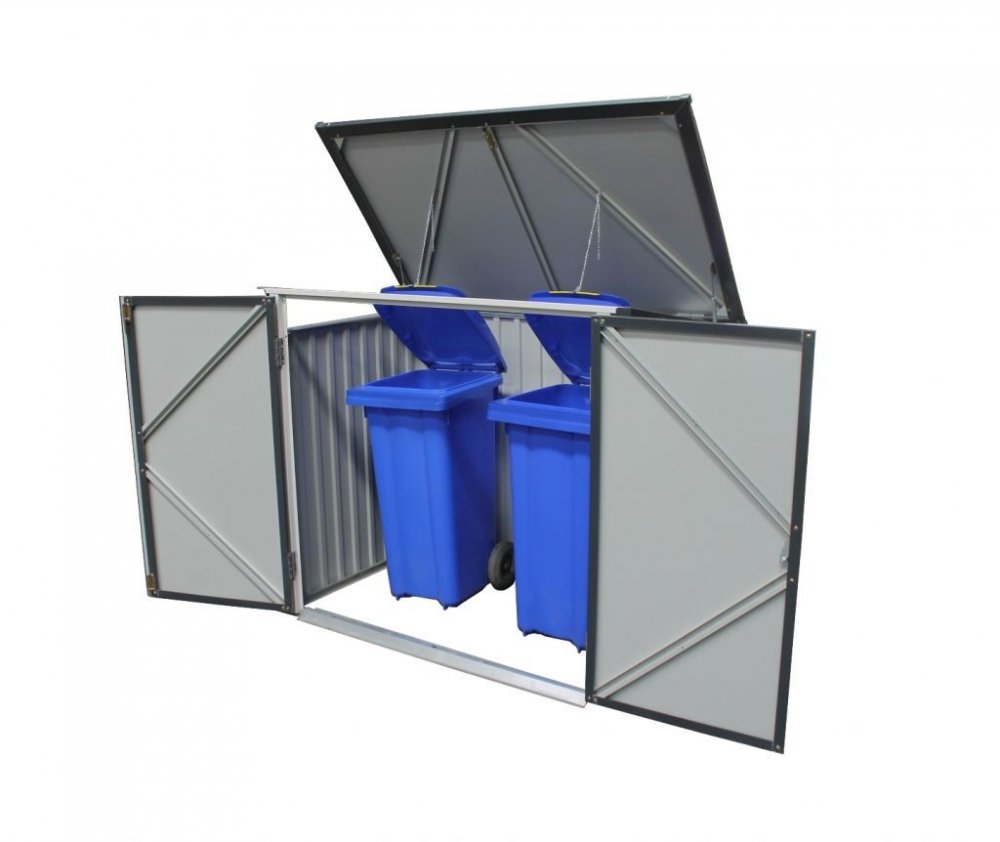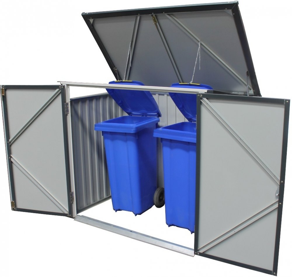Duramax kovový uzamykatelný k box uskladnění grilů, sekaček nebo pojme až dvě velké 240 l popelnice. Kovová, žárově zinkovaná konstrukce a práškový nástřik zaručují dlouhou životnost. Přístřešek je bezúdržbový. Snadný přístup k uskladněnému obsahu zaručují široké křídlové dvěře a víko. O lehčí manipulací s víkem se starají dvě pístnice. Víko je vybaveno řetízky, které po jeho otevření zvedají víka uložených poplenic. Box je samozřejmě uzamykatelný, zámek je součástí balení. Vlastnosti boxu na popelnice: masivní kovová konstrukce uzamykatelný (zámek i klíče jsou součástí balení) pístnice pro snadnou manipulací s víkem široké křídlové dvěře žárově zinkované práškový nástřik záruka 15 let proti prorezivění Technické údaje: rozměry vnější: šířka 154,2 cm x výška 130,5 cm x hloubka 96 cm rozměry vnitřní: šířka 147,5 x výška 121 cm (111,5 cm vzadu) x hloubka 87,4 cm půdorysný rozměr bez přesahů víka: šířka 151,6 x hloubka 91,6 cm hmotnost: 36 kg barva: antracit materiál: žárově zinkovaná ocel síla materiálu: konstrukce 0,5 mm, opláštění 0,33 mm