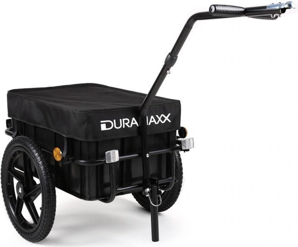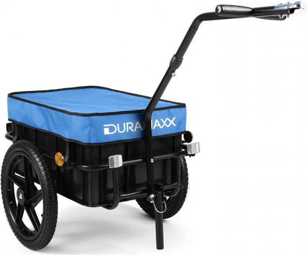 Přívěs na kolo Duramaxx Big Blue Mike je praktický prostorný vozík, vhodný pro všechna jízdní kola s 26" - 28" koly. Bez problémů si do jeho 70litrového prostorného boxu naložíte potřebná zavazadla, která překryjete voděodolnou plachtou a můžete vyrazit na výlet! Na stabilní rám z ploché oceli lze naložit náklad až do 40 kg. Případně ho lze odpojit od kola a použít jako ruční vozík s nosností až 60 kg. Kola s velikostí 16" dofouknete na jakékoliv benzínové pumpě. Pokud zrovna nepotřebujete profesionální přepravu, lze kola díky rychloupínacímu systému velmi rychle odebrat a přívěs použít jen jako přepravní bedýnku. O bezpečnost v silničním provozu se postarají výrazné odrazky - přední bílé, zadní červené a oranžové ve výpletech obou 16 " kol.