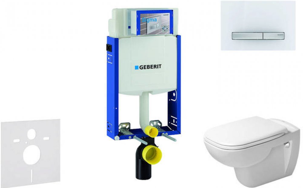 Sada předstěnové instalace, klozetu, WC sedátka a ovládacího tlačítka Obsahuje předstěnový instalační modul Geberit Kombifix (110.302.00.5), se splachovací nádržkou pod omítku Sigma 12 cm soupravu pro tlumení hluku (SP 156SET) závěsný keramický klozet Duravit D-Code, včetně WC sedátka (45700900A1) Rimless bezokrajové provedení splachování SoftClose pozvolné, tiché sklápění 2-činné ovládací tlačítk...