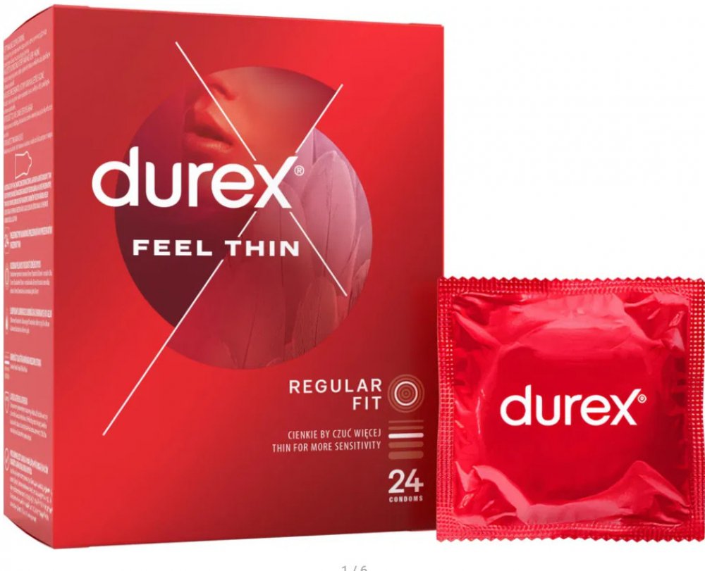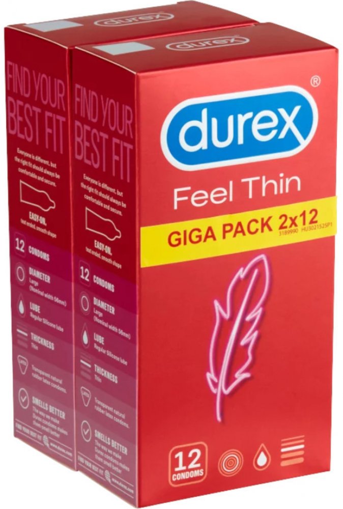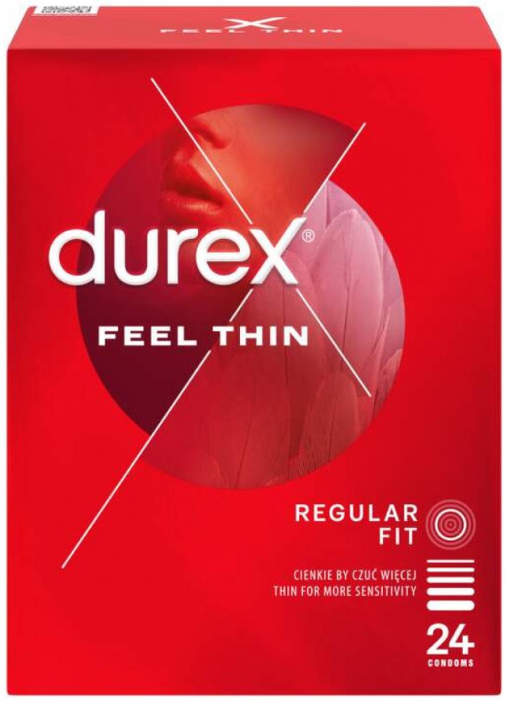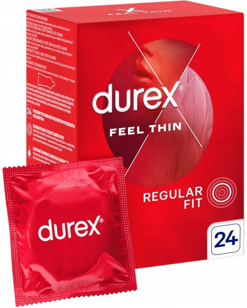 Kondomy Durex Feel Thin ve standardní velikosti.