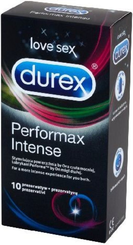 Kondomy DUREX PERFORMAX INTENSE si vzali to nejlepší z kondomů Durex Performa (oddalující účinek pro muže) a Durex Pleasuremax (kondom s žebrováním a stimulačními výstupky).
