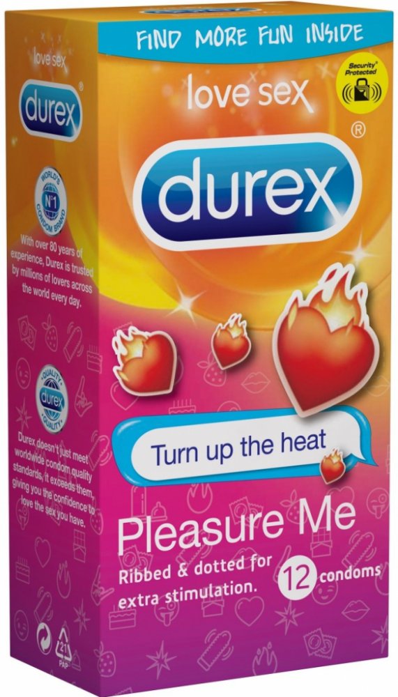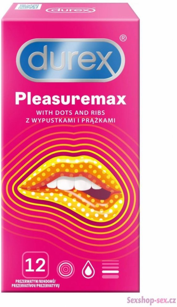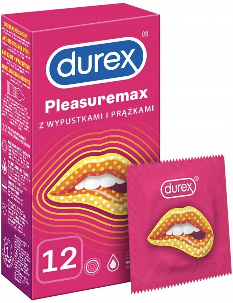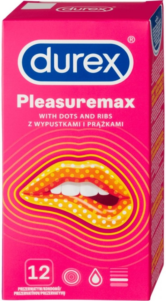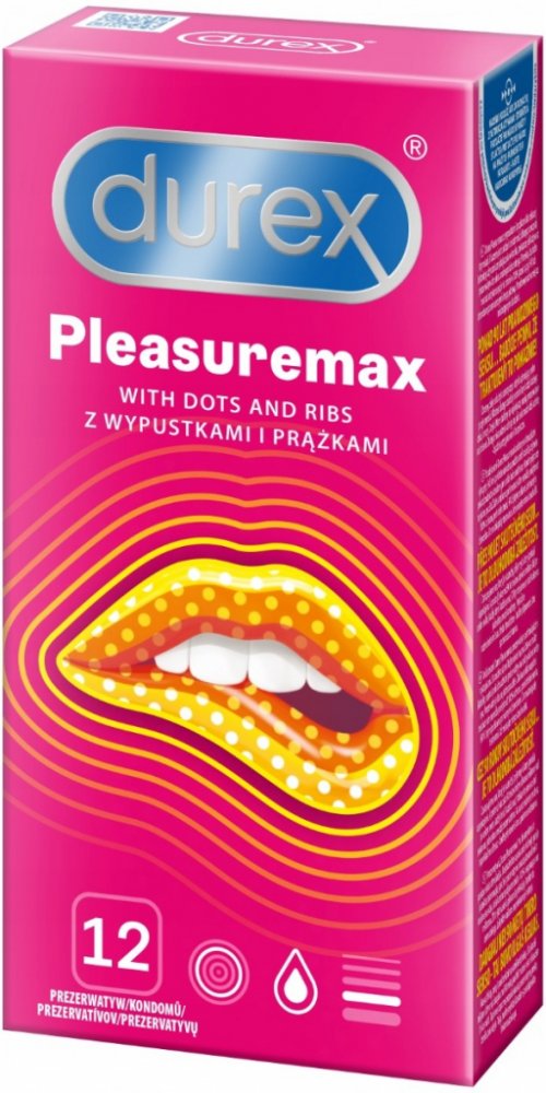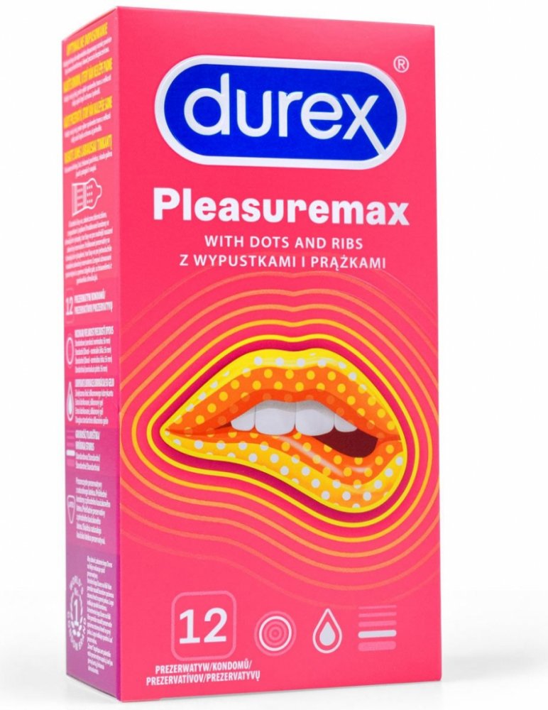 Kondomy Durex Pleasuremax jsou zdravotnické prostředky určené k zabránění početí a ochraně před pohlavně přenosnými chorobami. Pečlivě si přečtěte návod na použití uvnitř krabičky, zejména pokud používáte kondomy pro anální nebo orální sex. Kondom je pouze na jedno použití. Žádná antikoncepční metoda Vám nemůže poskytnout 100% ochranu proti otěhotnění, HIV či jiným pohlavně přenosným chorobám. Uchovávejte mimo dosah dětí.