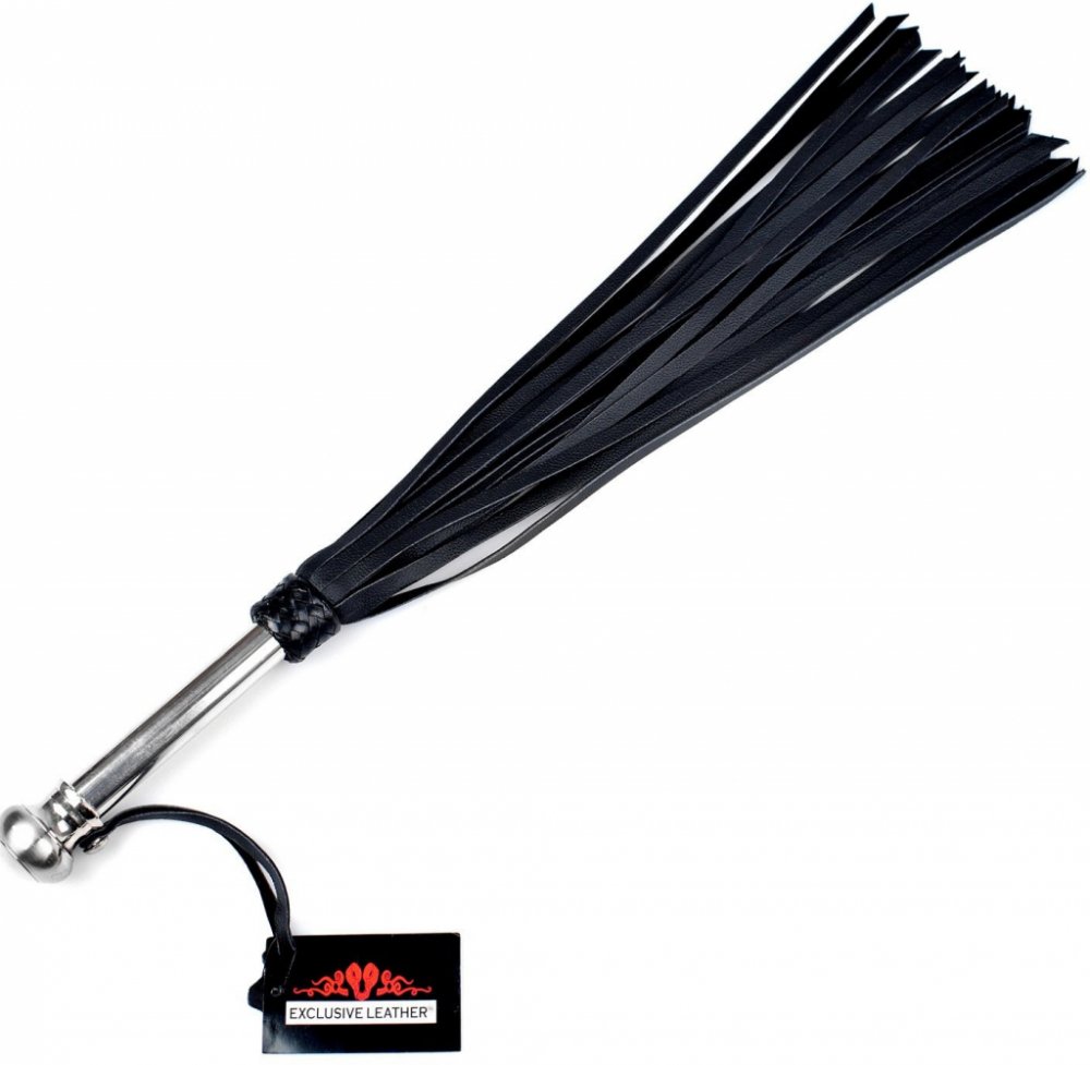 Dlouhé kožené důtky v černé barvě s kovovou rukojetí. Elegantní masivní důtky skvěle poslouží k potrestání neposlušné subiny. Třásně ale umí za odměnu i pohladit a polaskat. Smyslné doteky střídající se s bolestivým plácnutím dokáží vybičovat vzrušení na maximum. Třásně jsou vyrobeny ze středně tvrdé kůže, rukojeť je ve zlaté barvě s poutkem. Materiál: kůže, kov. Délka bez poutka: 75 cm. Barva: če...