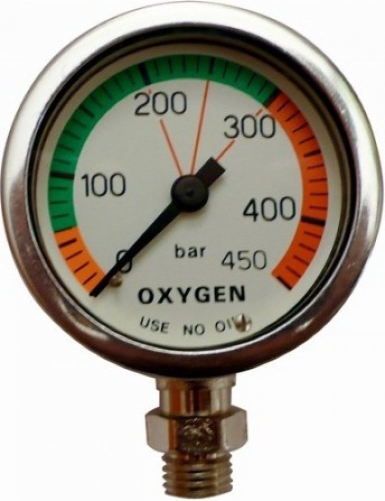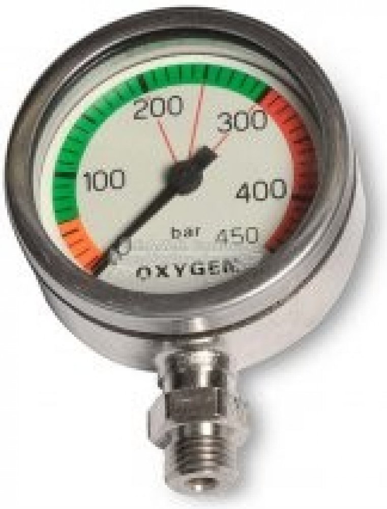 Kvalitní kovový manometr průměru 52mm určený pro čistý 100 procent kyslík. Maximální pracovní tlak 300bar. Minerální sklo. Niklovaný. Dodáván včetně osičky k hadici. Ideální na kyslíkové stage láhve či další měření čistého kyslíku např. u rebreatheru.