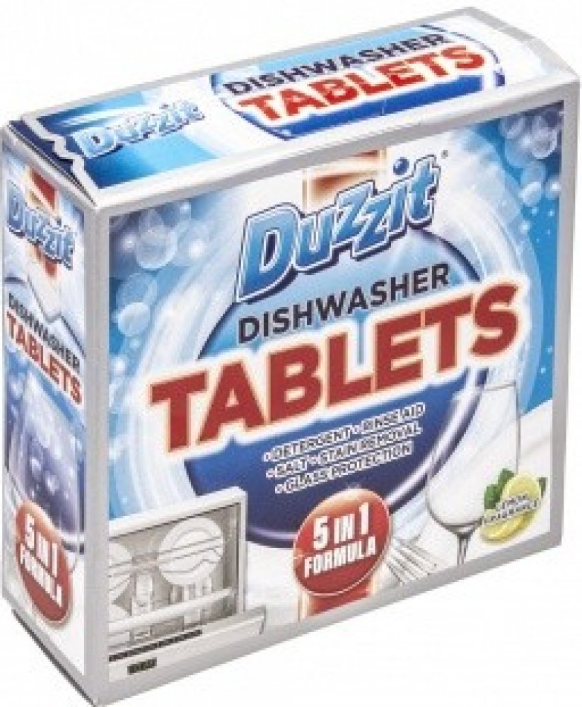 Každá tableta do myčky Duzzit je pečlivě sestavena z nejsilnějších ingrediencí. Jejich složení 5v1 znamená, že každá tableta poskytuje čistící prostředek, leštidlo, sůl, ochranu skla a odstraňování skvrn. Drobné částice v každé tabletě budou tvrdě pracovat do pronikání silných skvrn, sůl sníží usazeniny vodního kamene a dodatečná ochrana skla zabrání zakalení sklenic. Každá tableta je zabalená v praktickém plastovém sáčku, který se snadno otevírá a vkládá do myčky. Vysoký výkon těchto tablet umyje vaše nádobí, hrnce, pánve a sklenice, aby byly brilantně čisté.