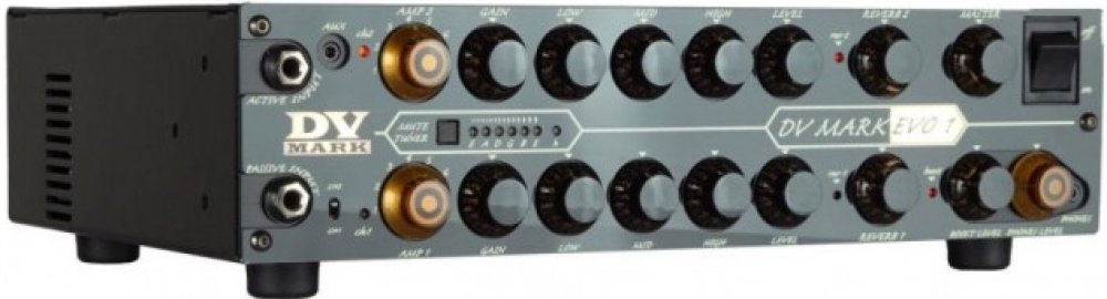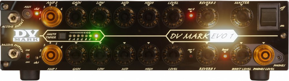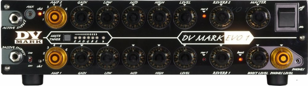 DV MARK EVO 1 má dva kanály s klasickým nastavením EQ, ovládáním reverbu u každého kanálu zvlášť, MIDI IN, vestavěnou ladičku, Aux In a výstup na sluchátka, efektovou smyčku, XLR linkový výstup, Boost a silný 250W MPT (Mark Proprietary Technology) koncový zesilovač s úžasně vřelým a neskutečně dynamickým tónem.