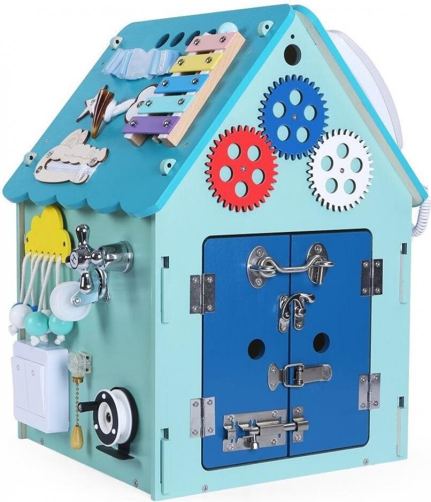 domeček, hrací prvky tvoří ozubená kolečka, zámek, hodiny, tkaničky a telefon, cestovní, vhodné od 3 let, dřevěná konstrukce, materiál hracích prvků dřevo, plast a kov, rozměry 45,5 × 37 × 33 cm (V׊×H) (745604338318)