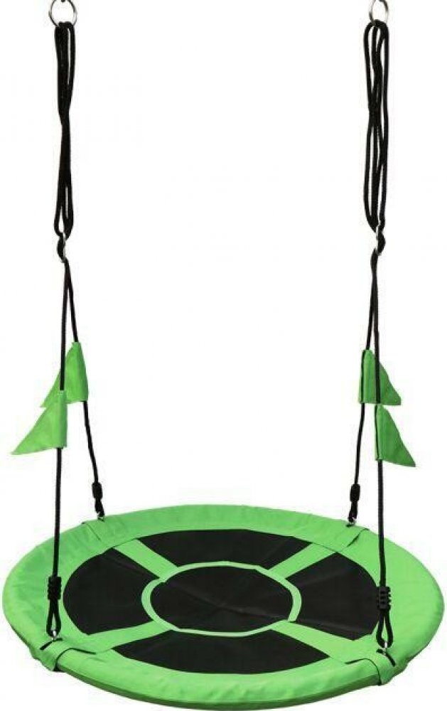 Houpačka Čapí hnízdo s vlajkami v zelené barvě z pevného materiálu s 2 karabinami pro zavěšení. Nezbytný pomocník pro objevitele venkovní zábavy na moderním dětském hřišti.